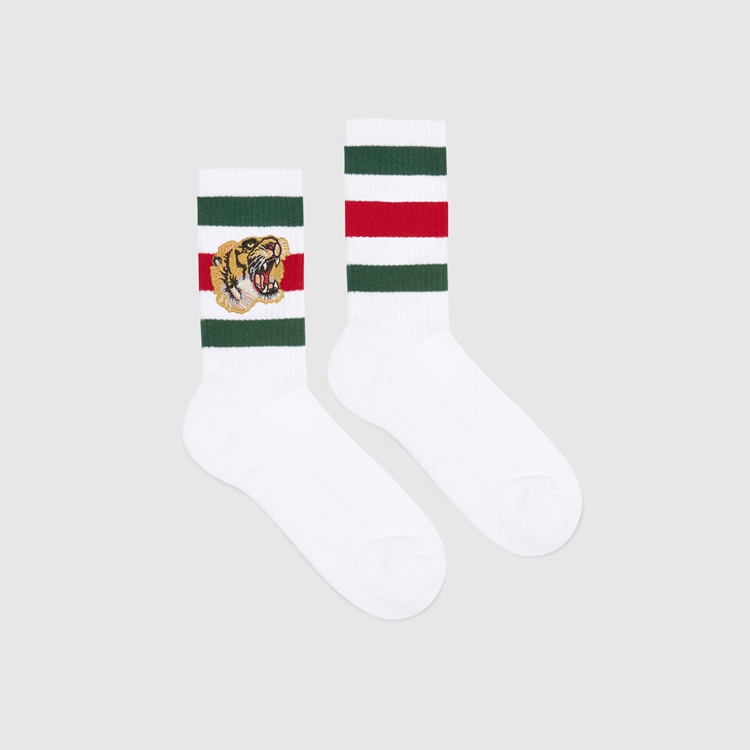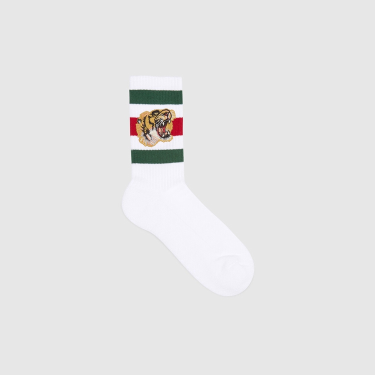 Style 450039 4G482 9066Calf and ankle socks continue to be an important Part of Gucci’s design narrative. Made from a cotton blend, These short socks feature The Web and embroidered tiger appliqué.