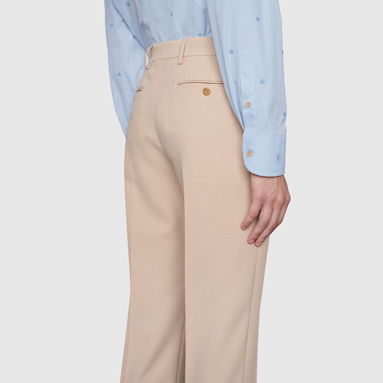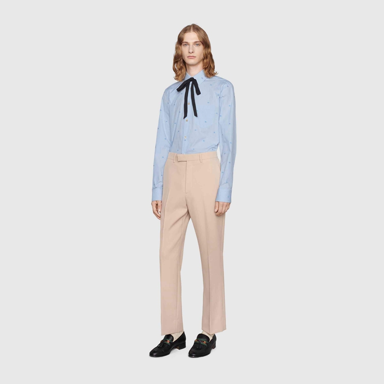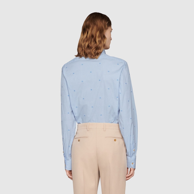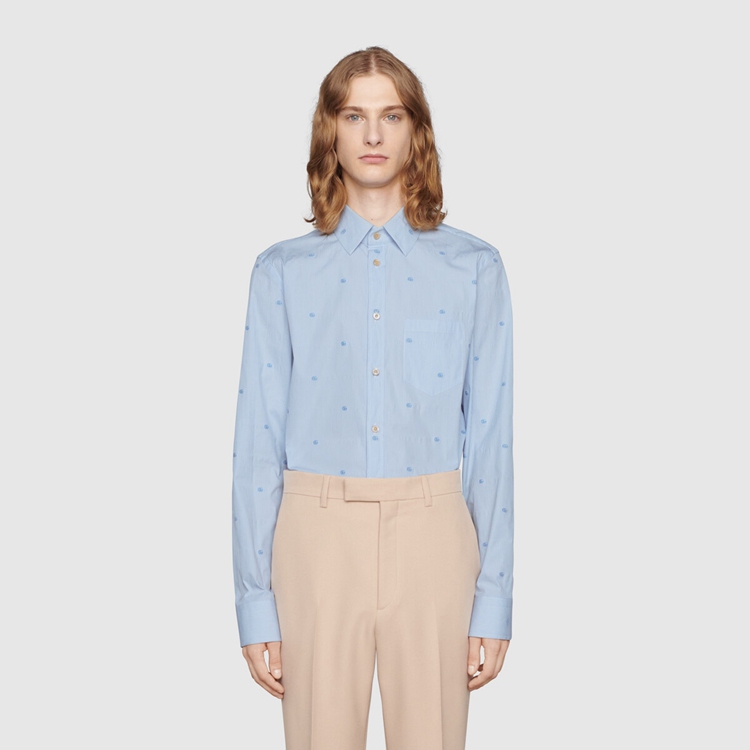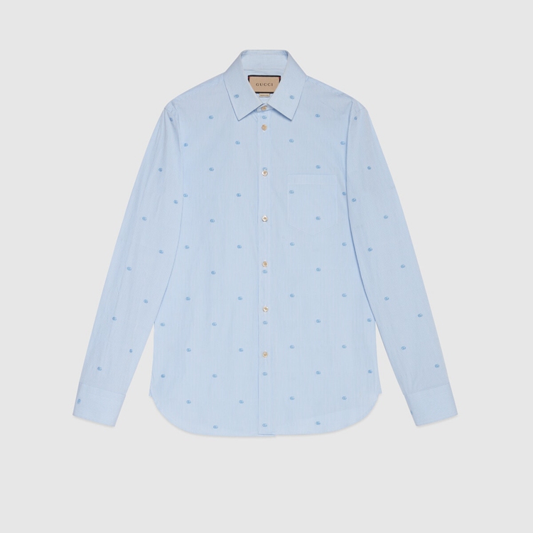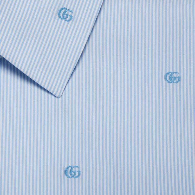 Style 673494 ZAHJ0 4421 A recurrent pattern of The latest collections, The light blue Double G pattern enriches This ivory and blue striped cotton shirt, designed With a point collar.