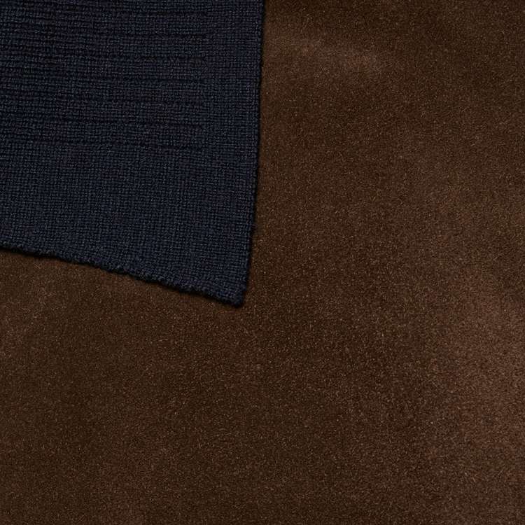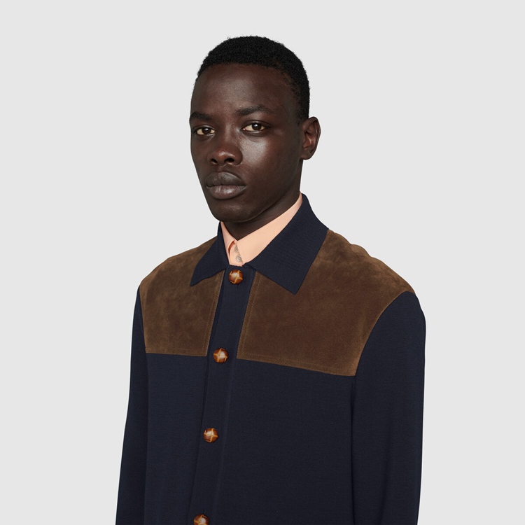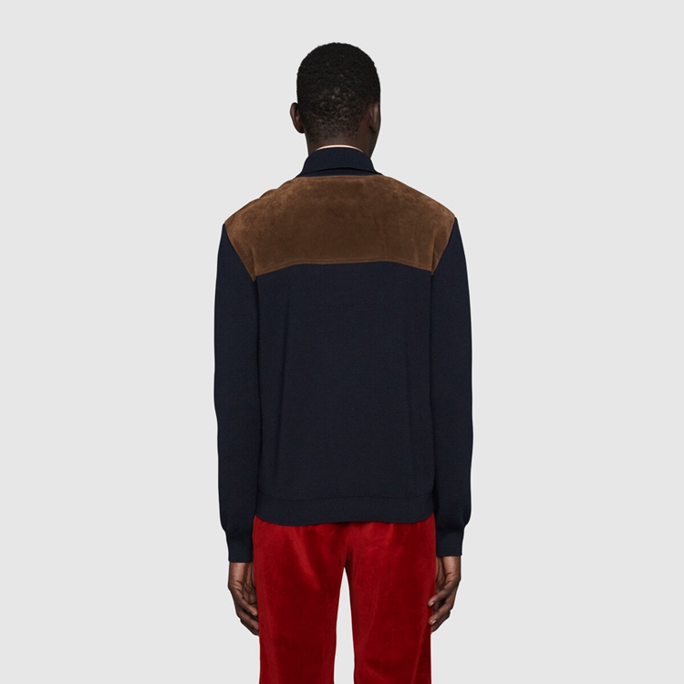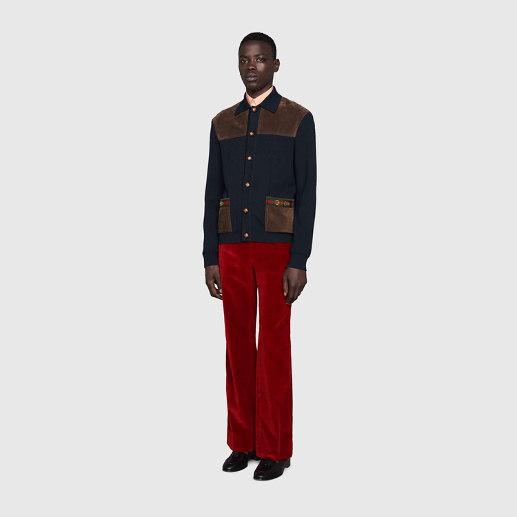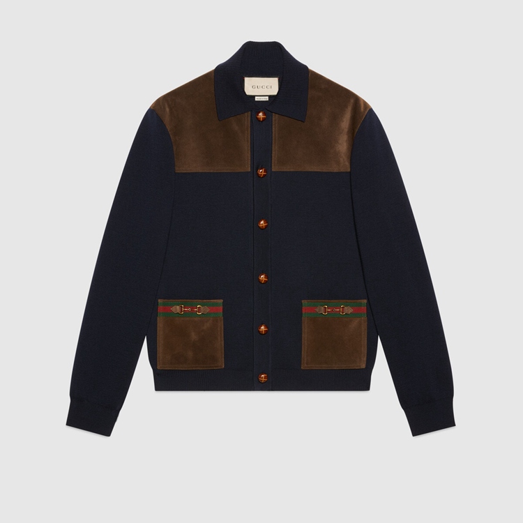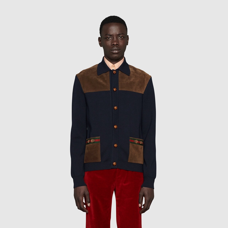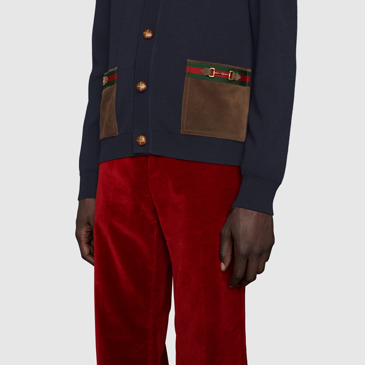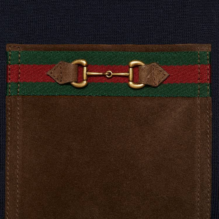 Style 673950 XKB3P 4912 Classic knitwear is reimagined With refined details and Emblematic House codes. Crafted from dark blue knit wool With brown suede detail, This cardigan brings back The green and red Web as an unexpected detail accenting The pockets, while The Horsebits add a precious note.