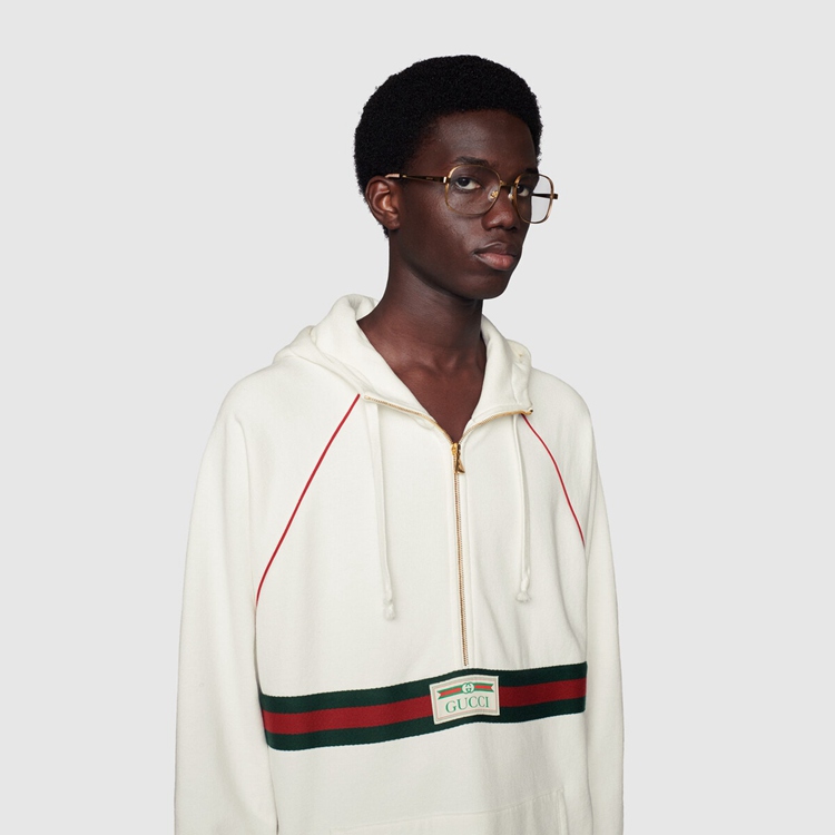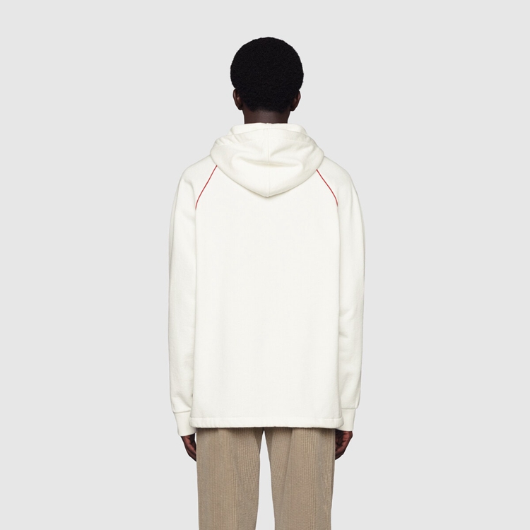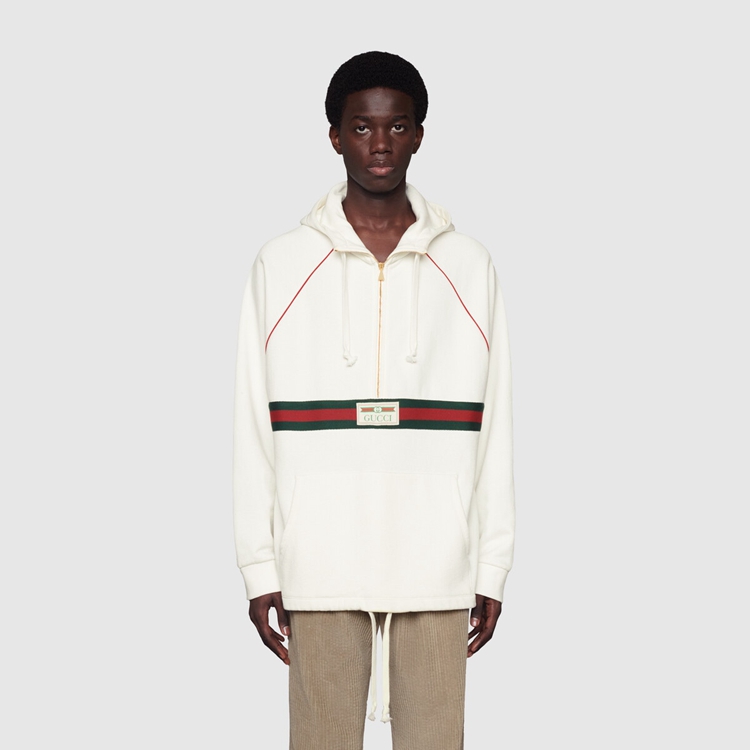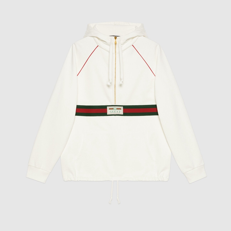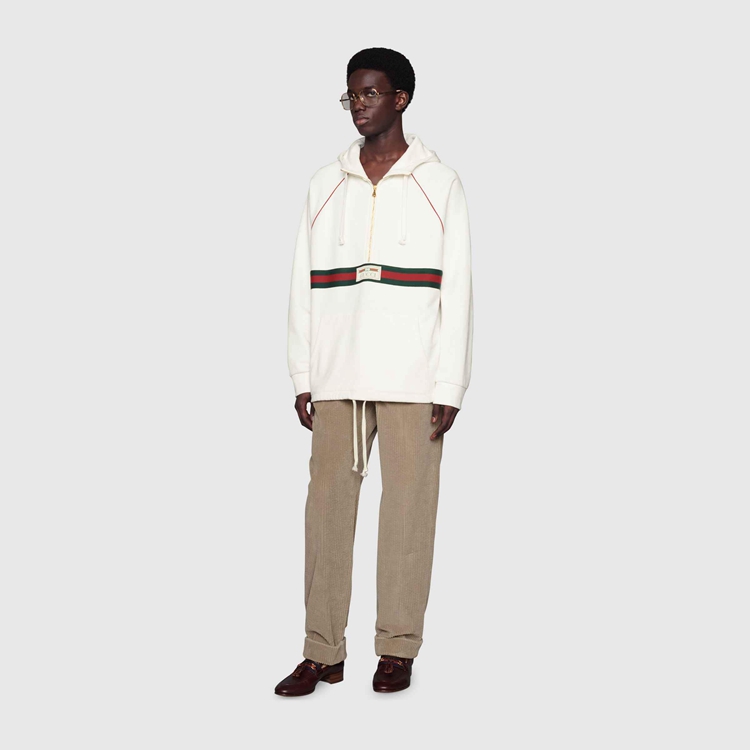 Style 645320 XJDAK 9146Reminiscent of a vintage tracksuit, This hooded sweatshirt features a front zip detail and contrast red piping. Emblematic House codes, like The green and red Web stripe and The Gucci jacquard label, enrich The design.