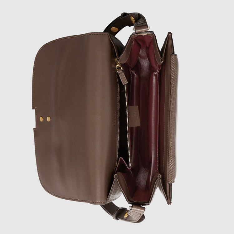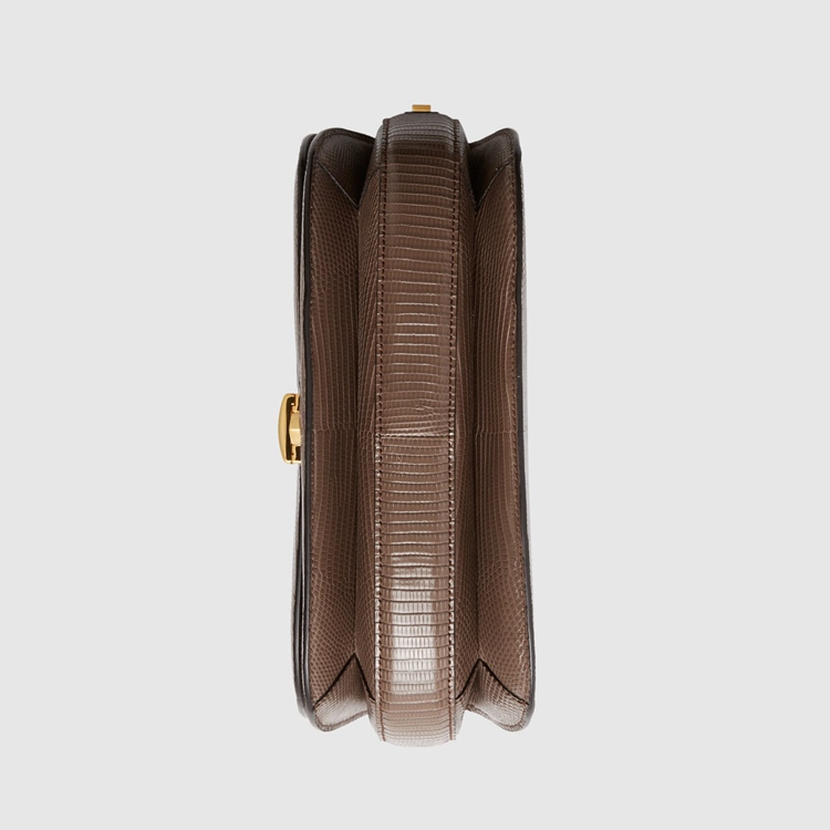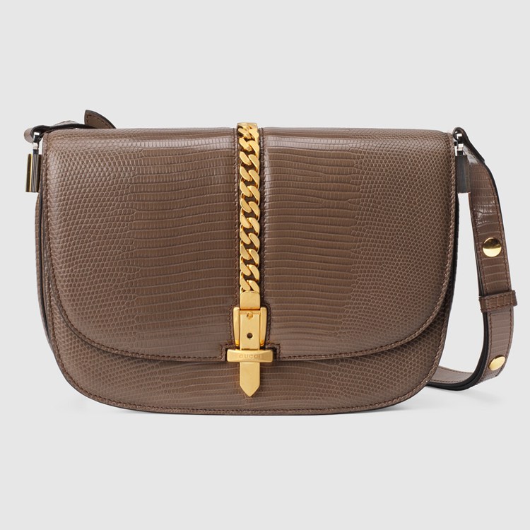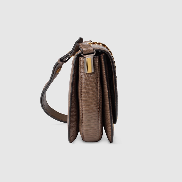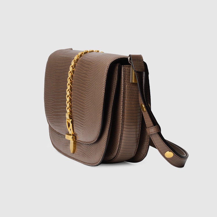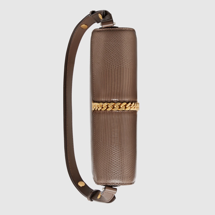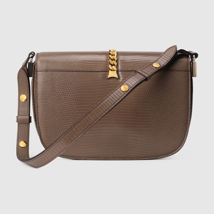 Style 601067 LUZ0X 2351Designed With its original archetype in mind, The Sylvie 1969 unifies The details of its archival inspiration With a contemporary spirit. The small shoulder bag in taupe lizard is defined by a narrow gold-toned metal chain fitted to The flap—a modern interpretation of The distinctive hardware. The softly rounded silhouette is completed With a special mechanism that adjusts The length of The shoulder strap so it can be carried on One shoulder or cross body.