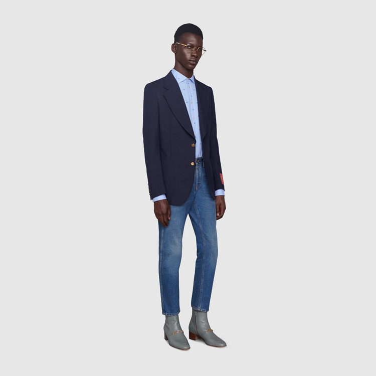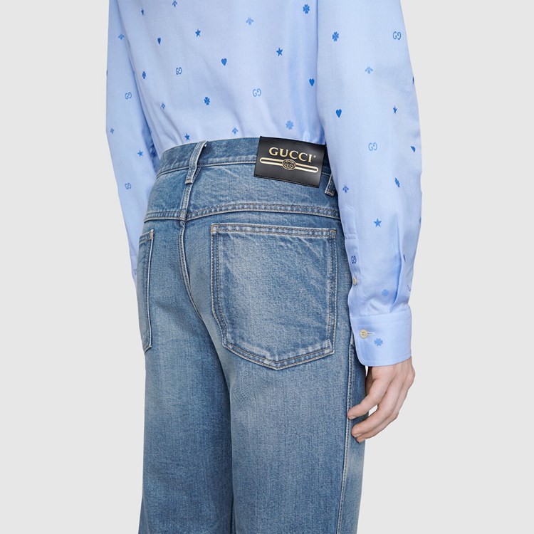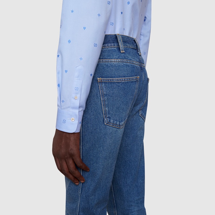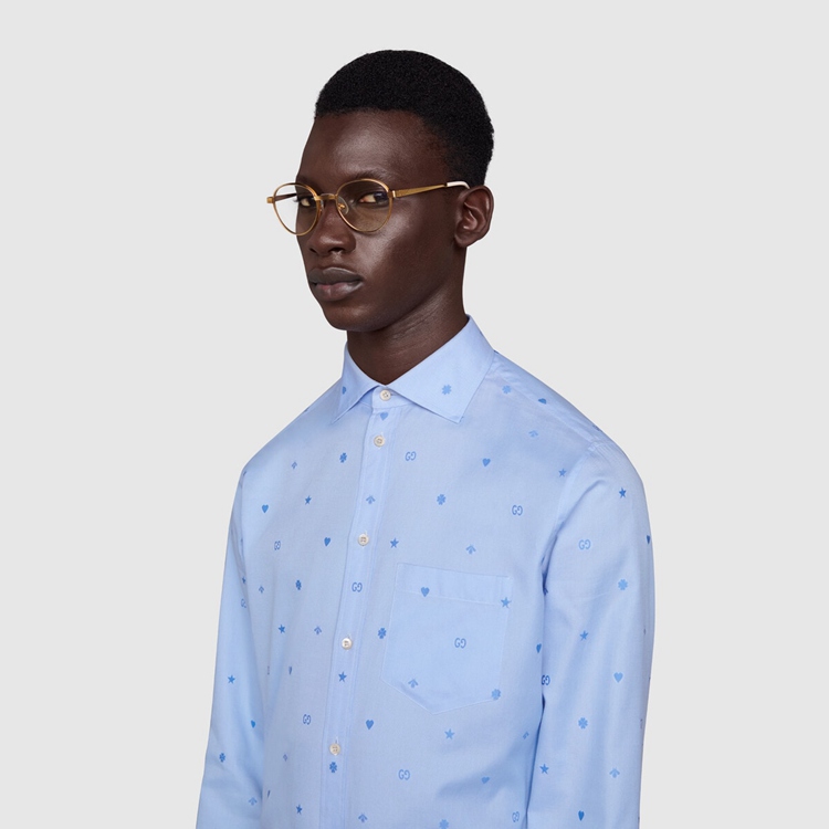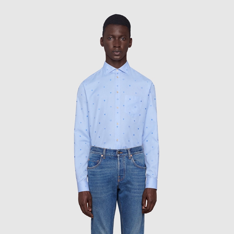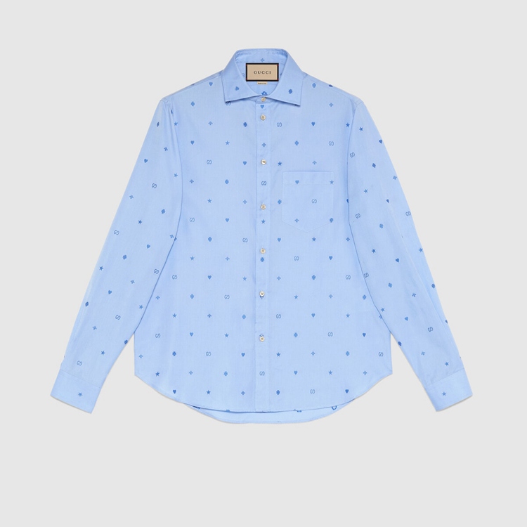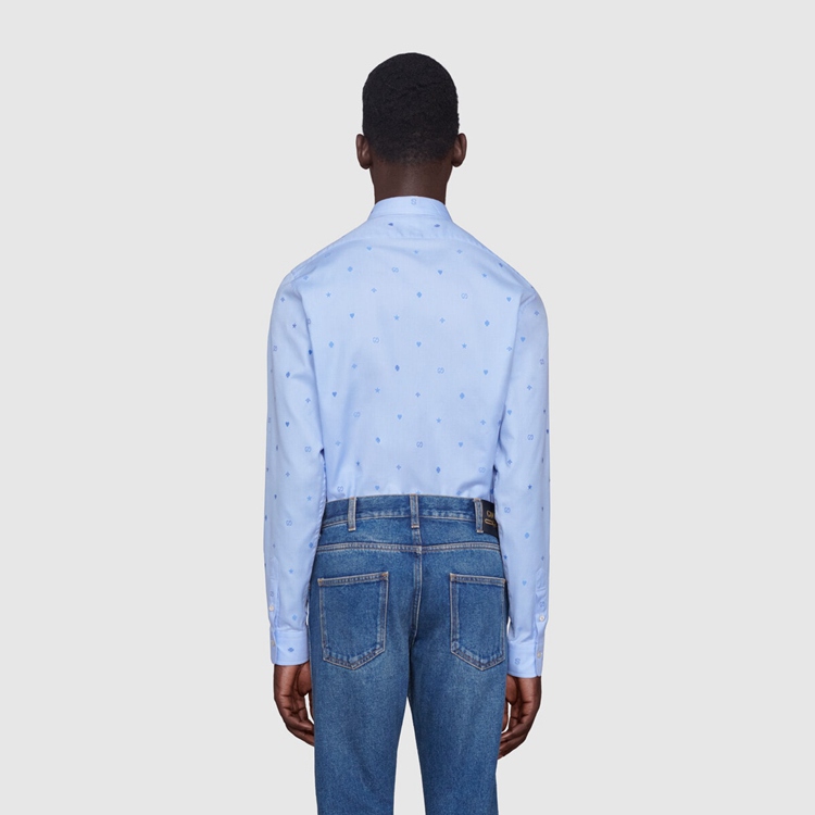 Style 597962 ZAC24 4910 A cotton shirt With a boxy fit featuring Emblematic symbols of The House against a light blue background. A mix of bees, hearts, GG logos, clovers and stars animate The silhouette.