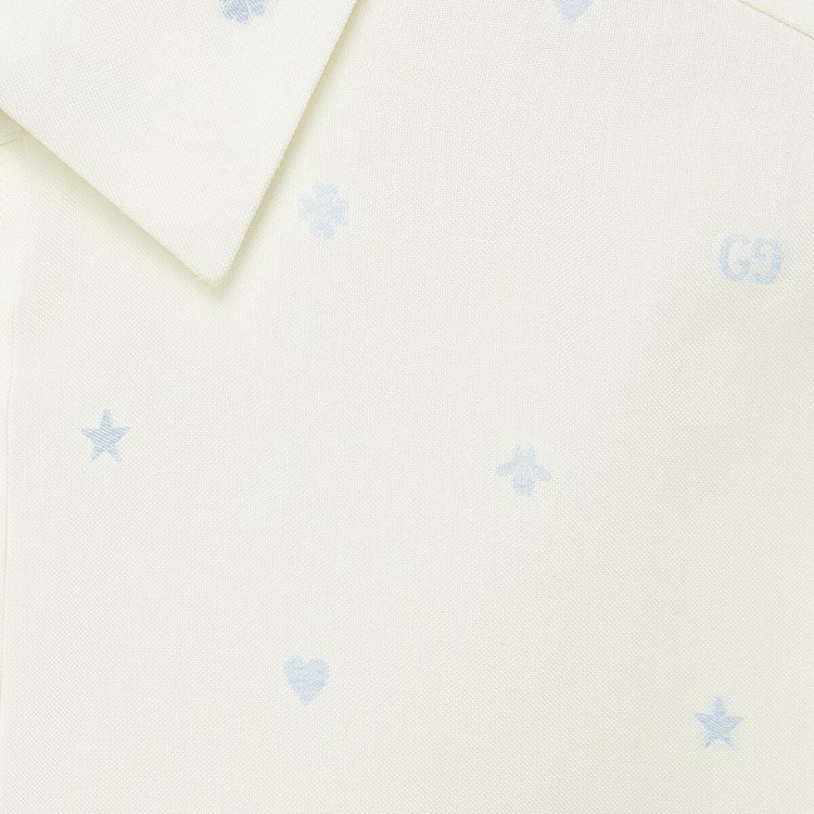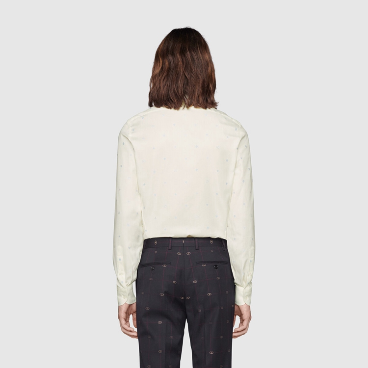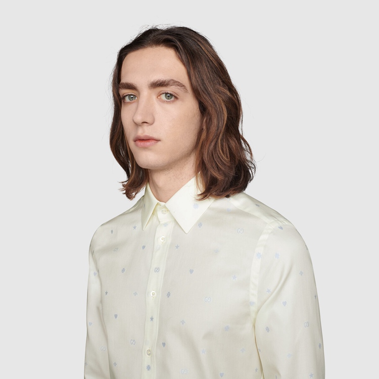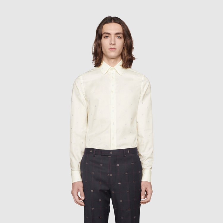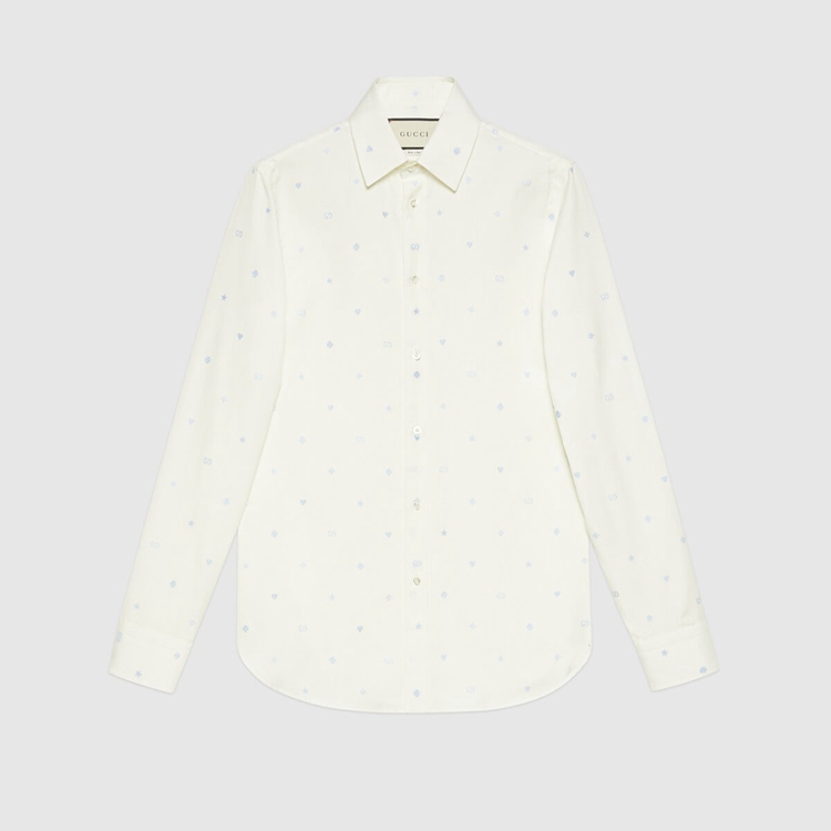 Style 644986 ZAEDJ 9011 The bee, The star, The heart, The shamrock, and The GG logo: The House Emblematic symbols come together in The delicate fil coupé pattern that decorates This white Oxford shirt. A point collar finishes The tailored design.