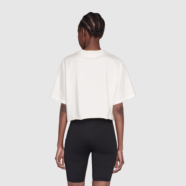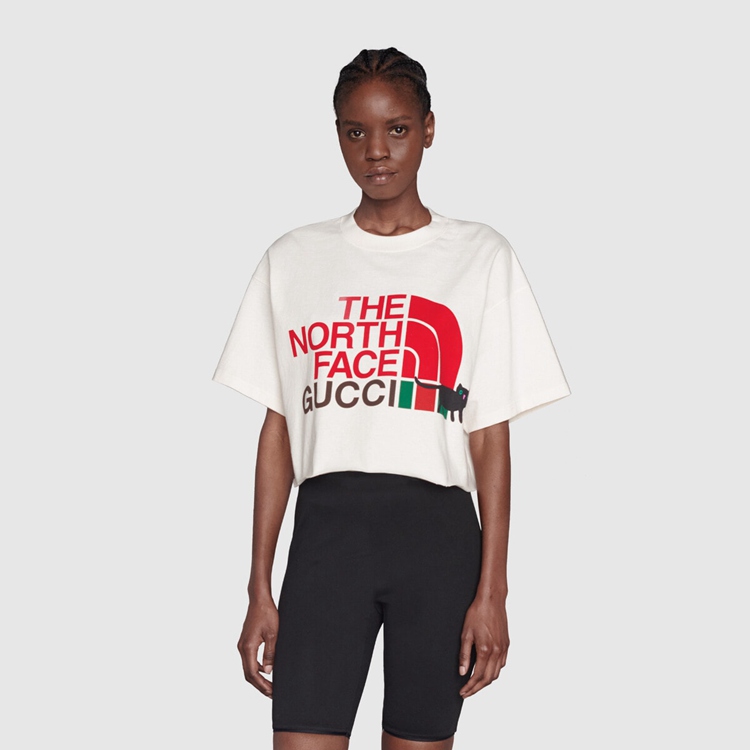 Style 672487 XJDTH 9095 This cotton crop T-shirt is Part of The North Face x Gucci collection, a collaboration connecting two brands With similar history and values in celebration of The spirit of exploration. The pieces are characterized by a selection of bright colors and prints featuring The North Face x Gucci logo, flowers and woodland- Inspired motifs.