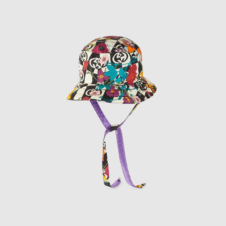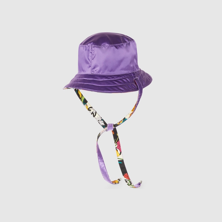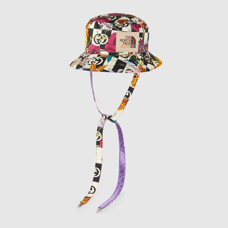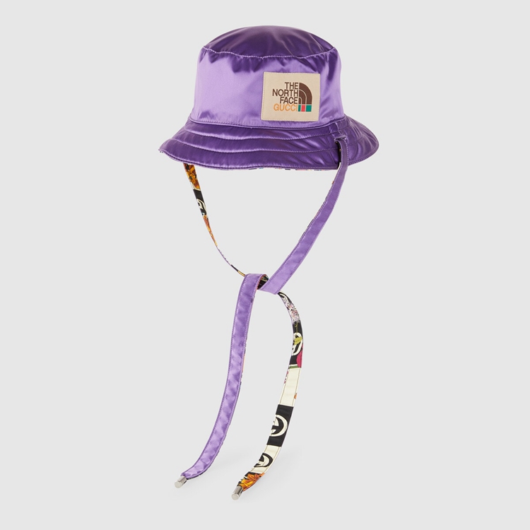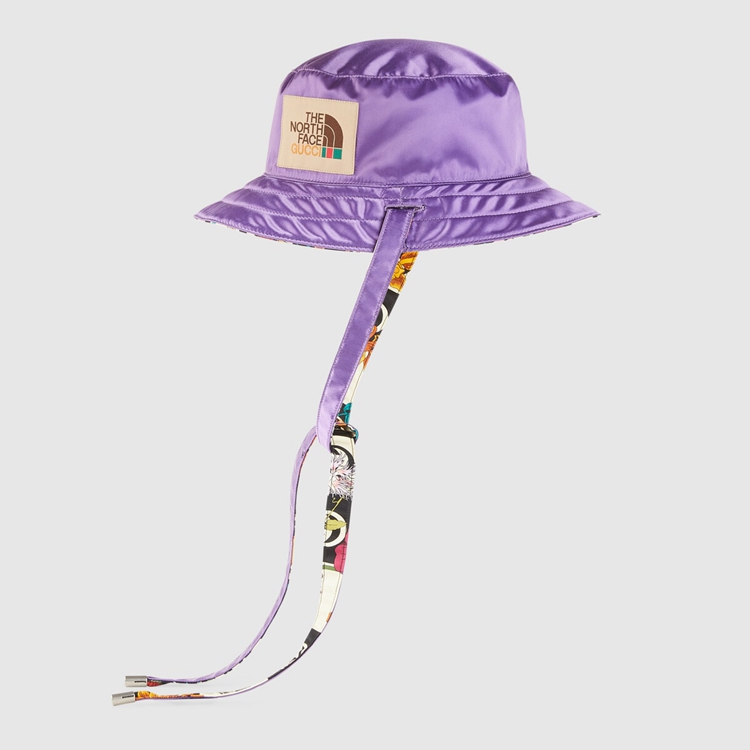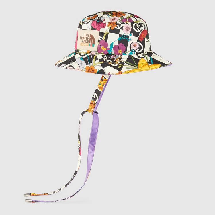 Style 672152 4HAJQ 1171 This reversible nylon hat is Part of The North Face x Gucci collection, a collaboration connecting two brands With similar history and values in celebration of The spirit of exploration. The pieces are characterized by a selection of bright colors and prints featuring The North Face x Gucci logo, flowers and woodland- Inspired motifs.