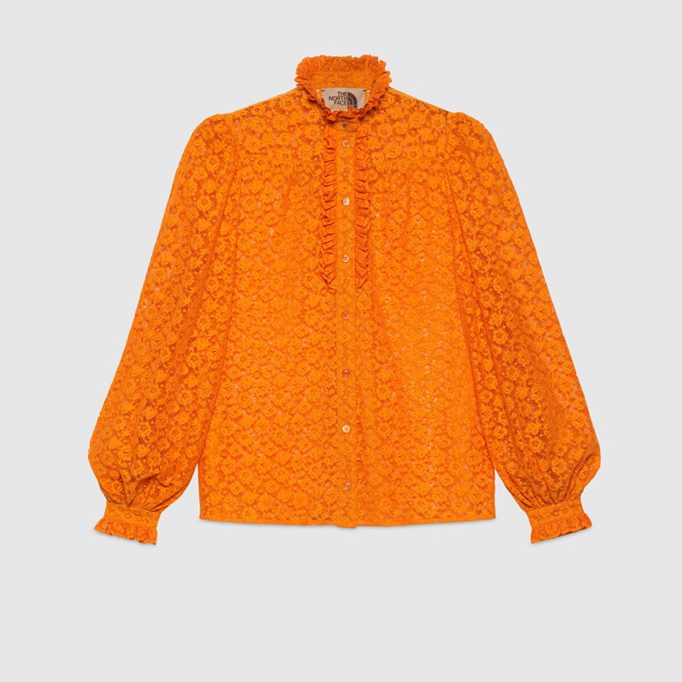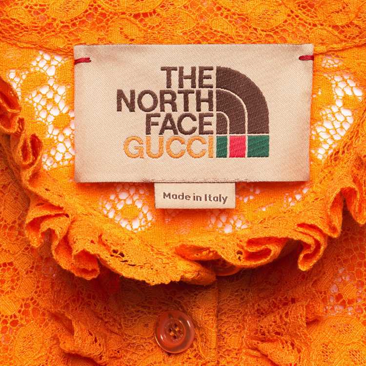 Style 683878 ZAGNR 7092 This vintage cotton lace shirt is Part of The North Face x Gucci collection, a collaboration connecting two brands With similar history and values in celebration of The spirit of exploration. The pieces are characterized by a selection of bright colors and prints featuring The North Face x Gucci logo, flowers and woodland- Inspired motifs.