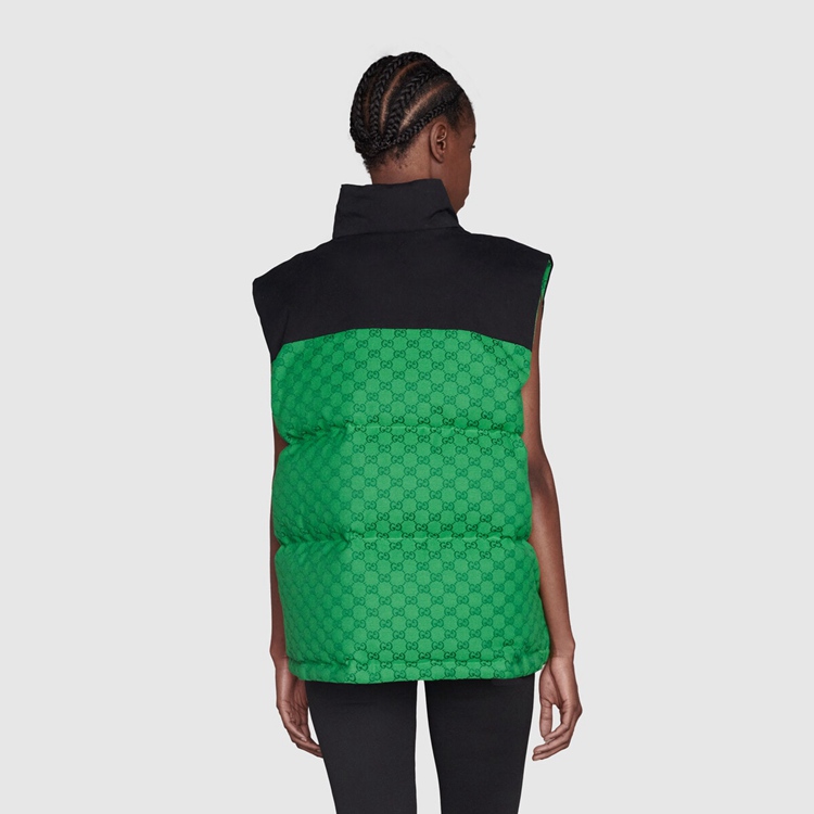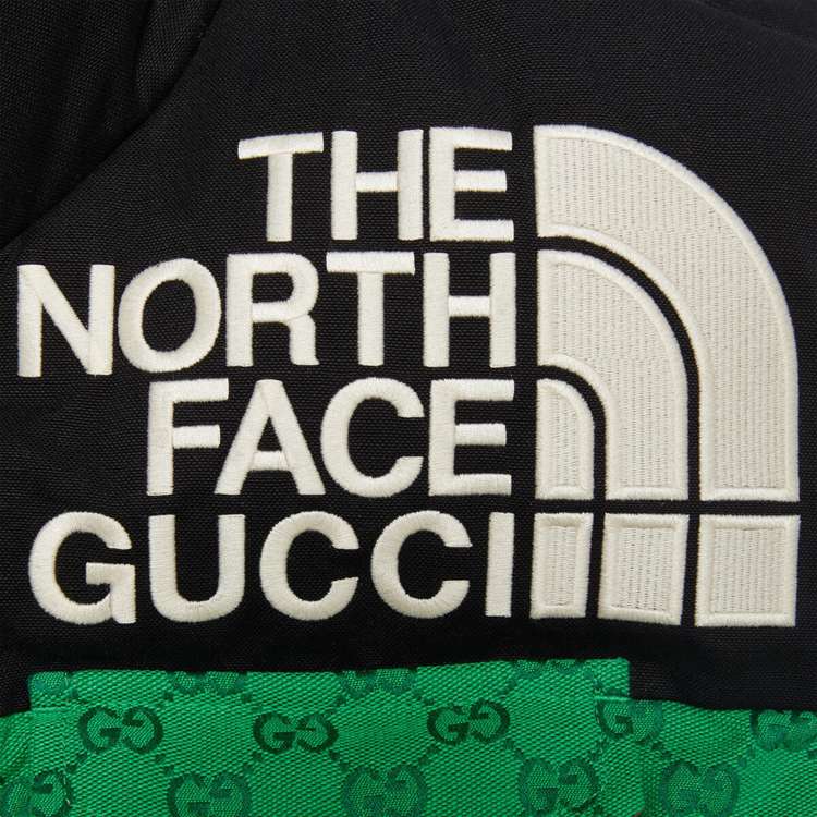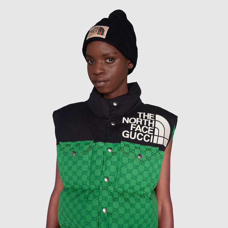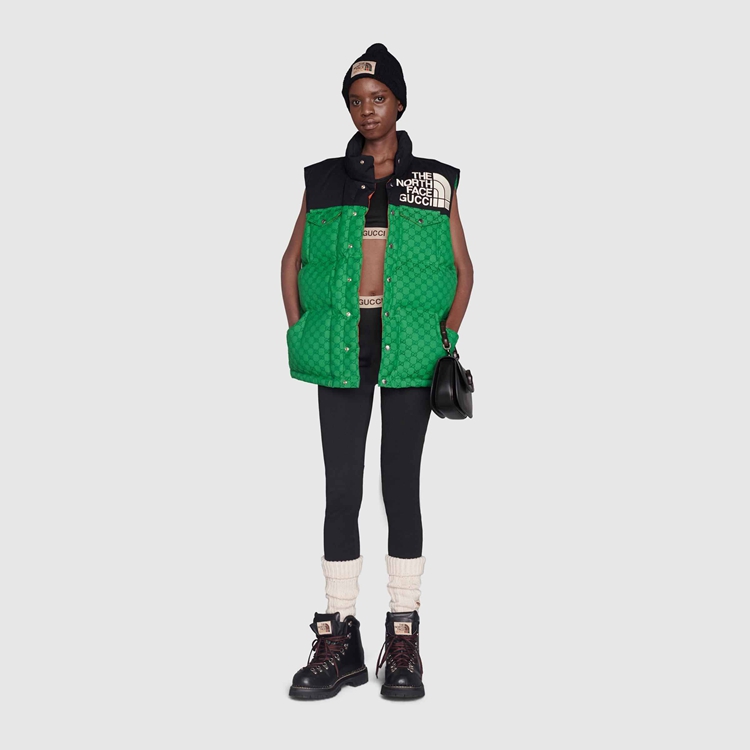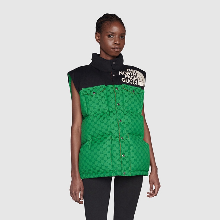 Style 670910 Z8APZ 3348 This GG canvas down padded vest is Part of The North Face x Gucci collection, a collaboration connecting two brands With similar history and values in celebration of The spirit of exploration. The pieces are characterized by a selection of bright colors and prints featuring The North Face x Gucci logo, flowers and woodland- Inspired motifs.