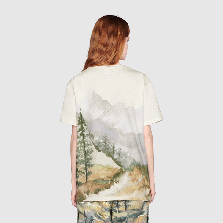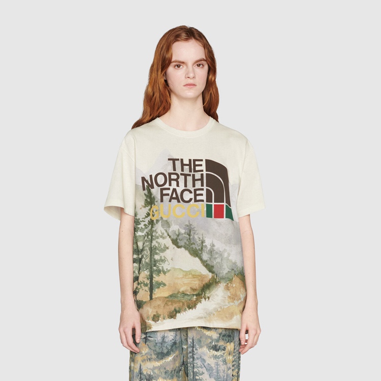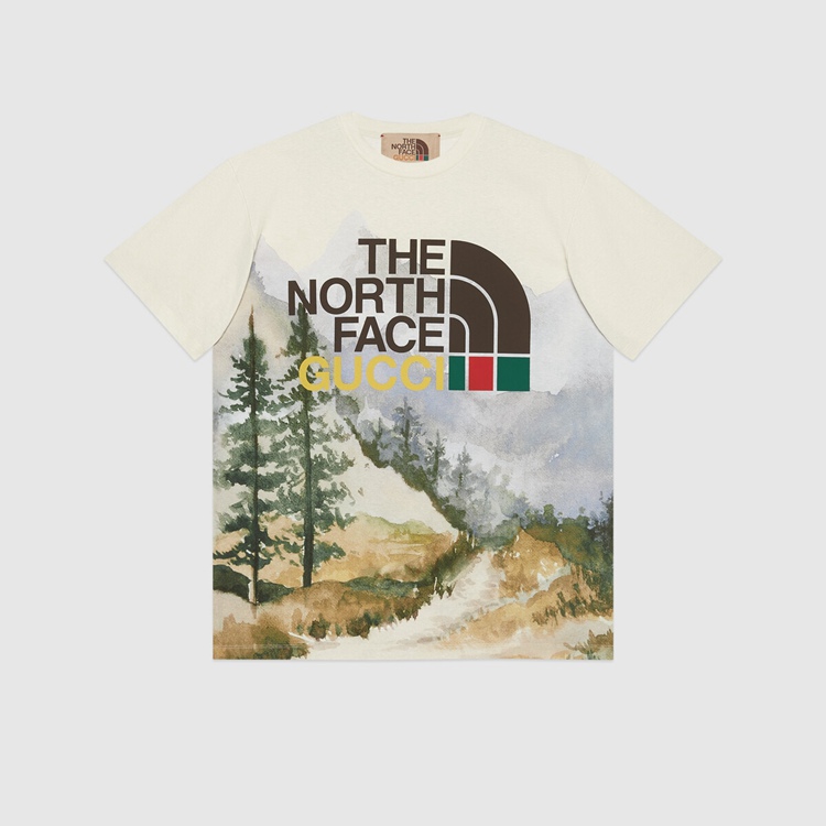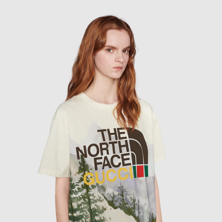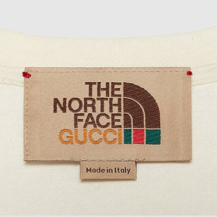 Style 672475 XJDS8 3466 This cotton T-shirt is Part of The North Face x Gucci collection, a collaboration connecting two brands With similar history and values in celebration of The spirit of exploration. The pieces are characterized by a selection of bright colors and prints featuring The North Face x Gucci logo, flowers and woodland- Inspired motifs.