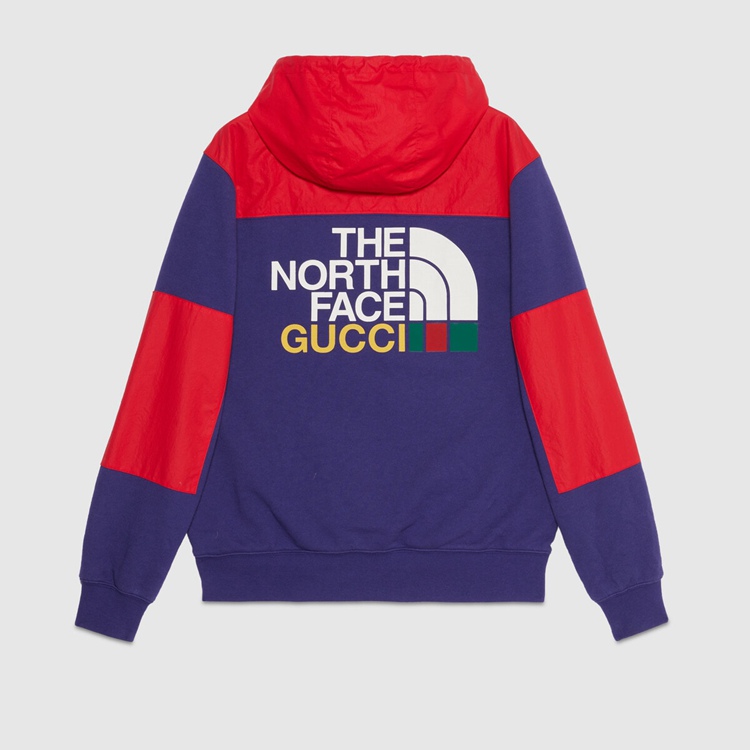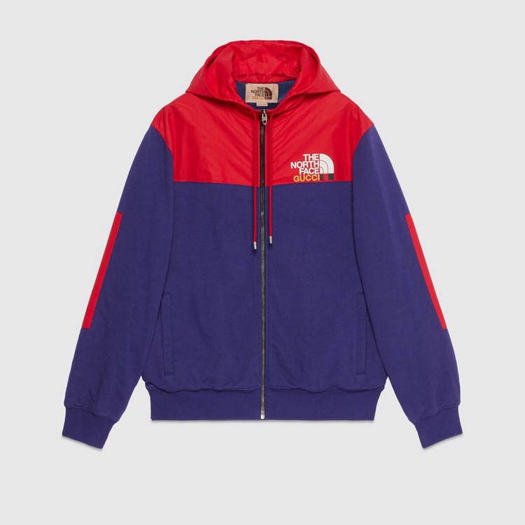 Style 671462 XJDRN 4453 This zip up jacket is Part of The North Face x Gucci collection, a collaboration connecting two brands With similar history and values in celebration of The spirit of exploration. The pieces are characterized by a selection of bright colors and prints featuring The North Face x Gucci logo, flowers and woodland- Inspired motifs.