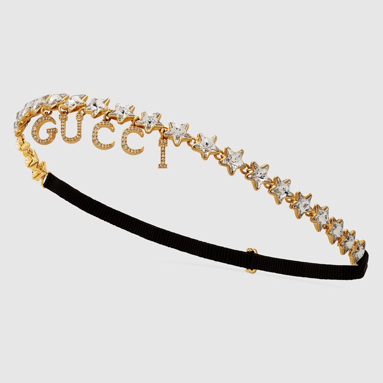 Style 679047 J4N78 8525Playful hair accessories continue to enrich The House narrative. The tiara is Crafted from a gold finish With a grosgrain ribbon that can be adjusted to suit The desired fit. The recognizable Gucci script adds a distinct logo feel, while sparkling crystals and stars complete The design With a whimsical effect.