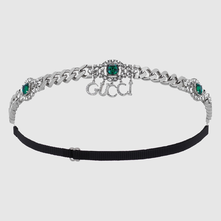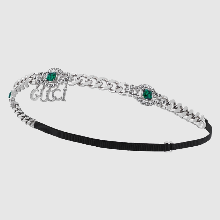 Style 676535 IAAAM 8614Hair accessories continue to enrich The House narrative. This tiara is illuminated by green sparking crystals and delicate flower details, evoking a sense of fun and glamor. A crystal Gucci script completes The style, while a grosgrain ribbon can be adjusted to suit The desired fit.
