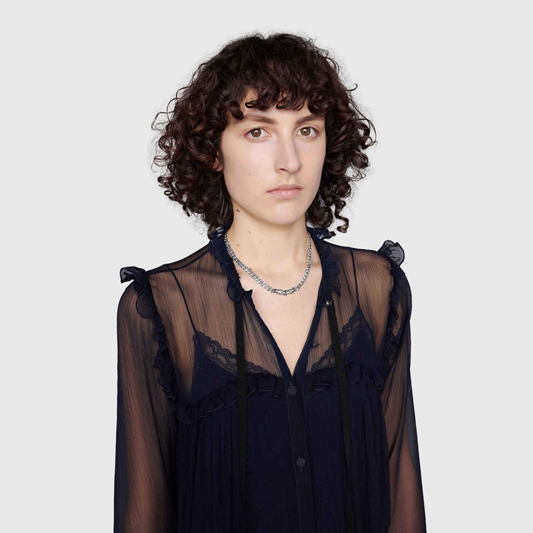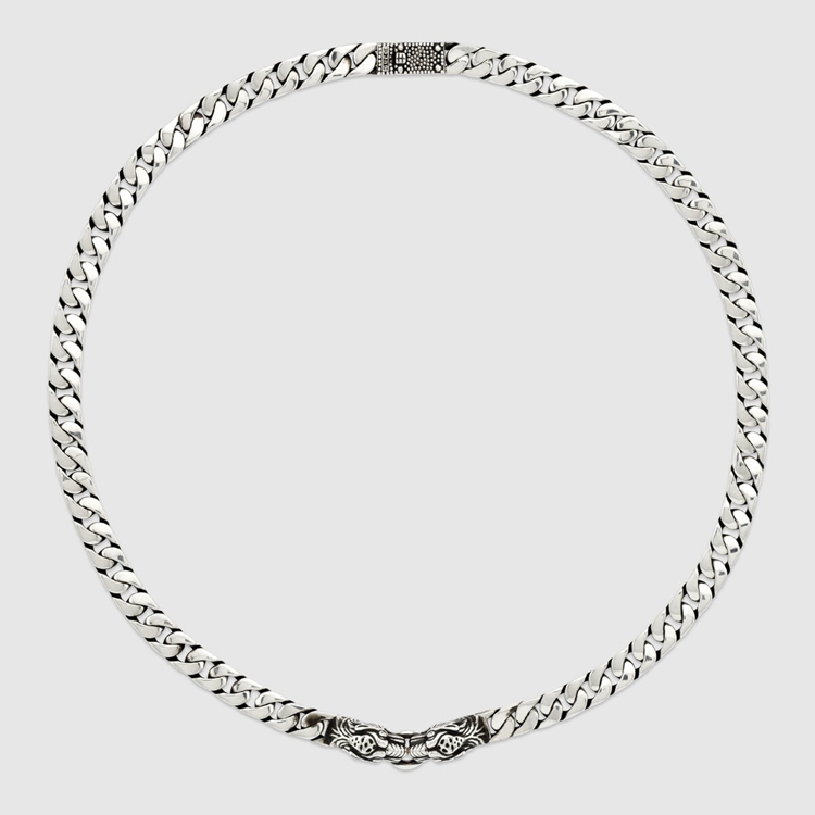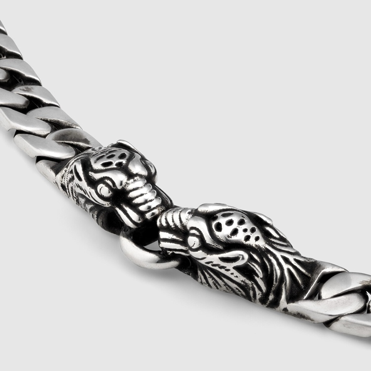 Style 627286 J8400 0701 The distinctive textured tiger head detail has quickly become a House icon, referencing The Greek god Dionysus, who in myth is said to have crossed The river Tigris on a tiger sent to him by Zeus. Rendered in 925 sterling silver, The detail decorates a necklace.