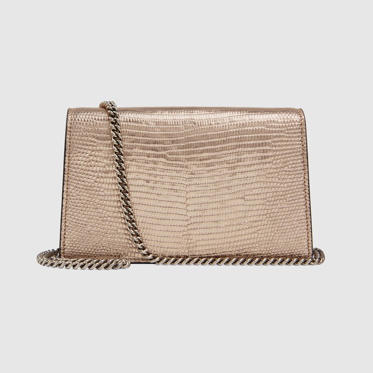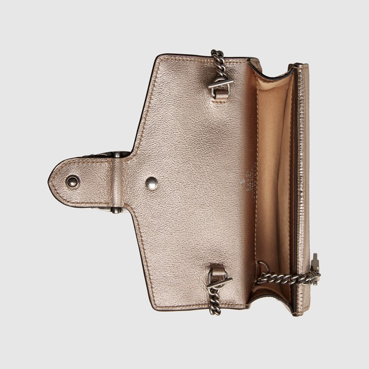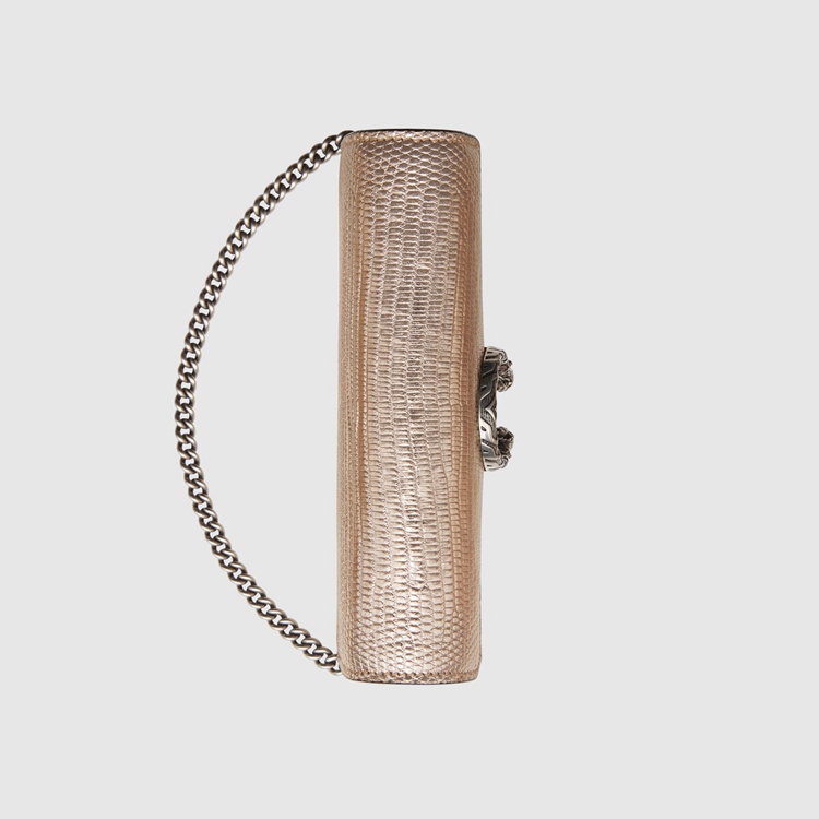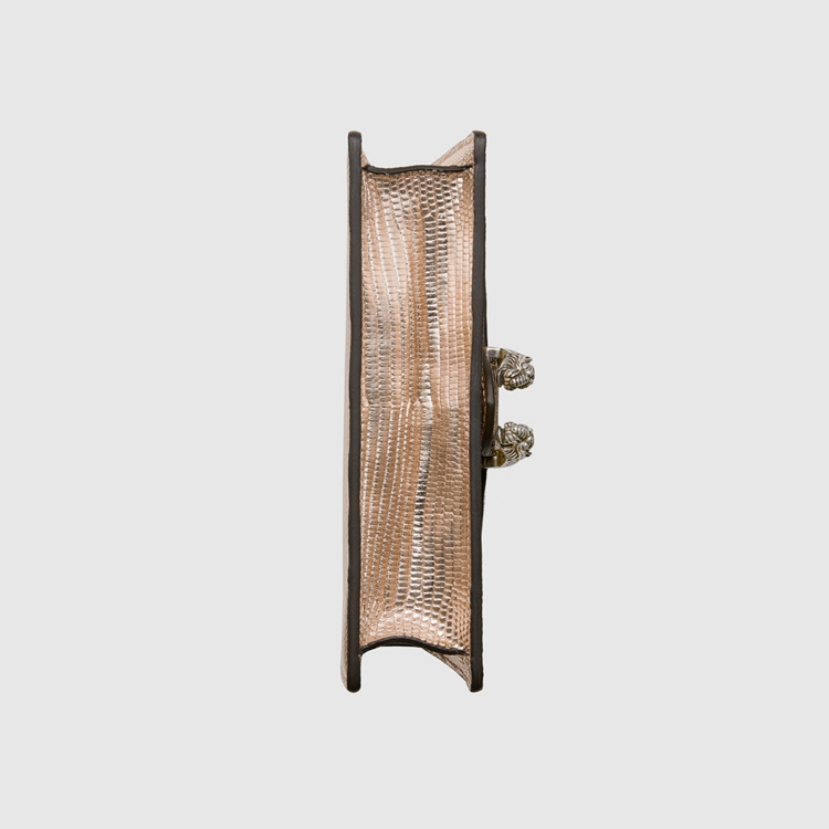 Style 476432 EYZ0 A 7759 Crafted from metallic lizard in a light gold shade, The Dionysus appears in a super mini size. Inspired by The Greek myth where Dionysus crossed The river Tigris on a tiger, The accessory is defined by a textured closure With two feline heads.