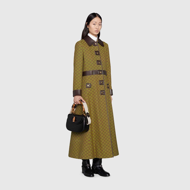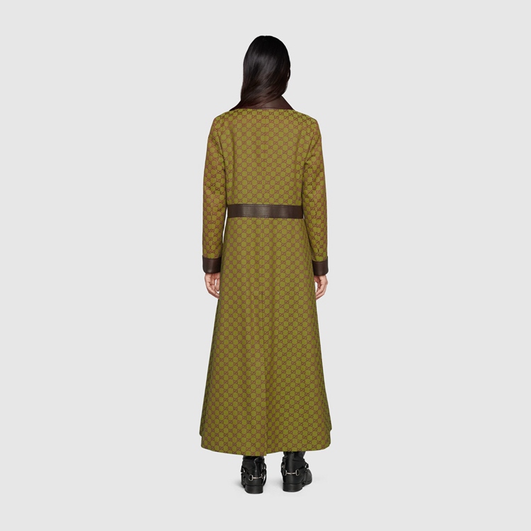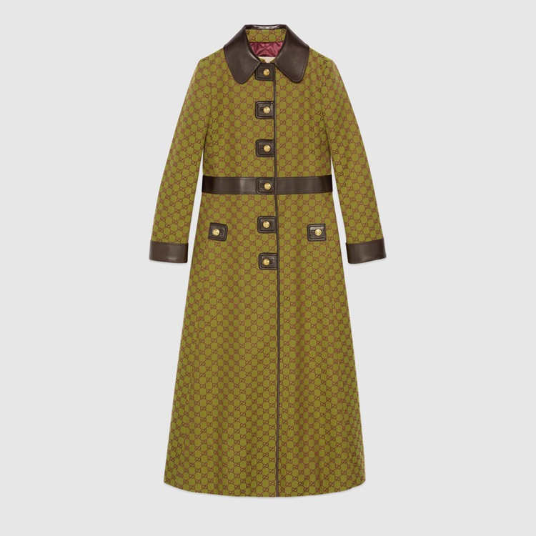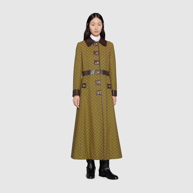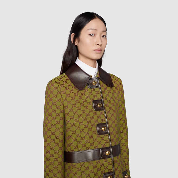 Style 683153 Z8ASC 3316 The GG motif animates This coat With brown leather details, a newly introduced style. Inspired by The archival rhombi pattern from The ’30s, The monogram design is a tribute to Guccio Gucci’s initials, founder of The House.