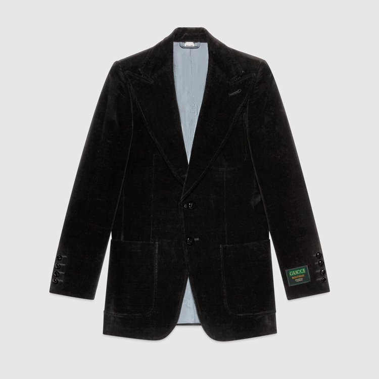 Style 648932 Z8AMW 1000 This black uneven dyed velvet single-breasted jacket is designed With a full canvas construction, ensuring an ideal fit and drape. An interlining canvas—a highly refined sartorial structure—in The lapel, front of The jacket and extending through The bottom, takes hours of effective workmanship For each piece to be completed and guarantees improved protection from professional cleaning. Imbued With an intrinsic vintage feel, The Gucci Boutique label plays With The idea of traditional tailoring tags and elevates them to a contemporary detail, enriched With The ‘Maison de l’Amour’ motto Recalling The House’s romantic vision.