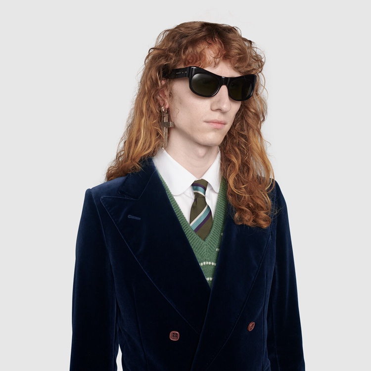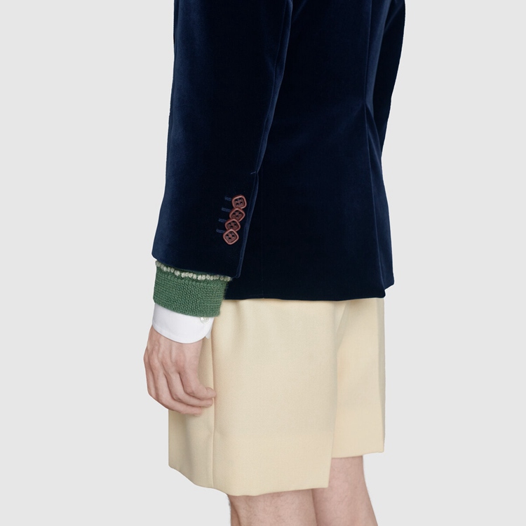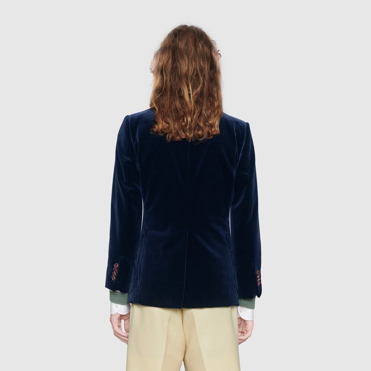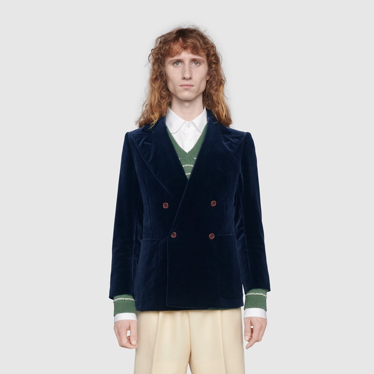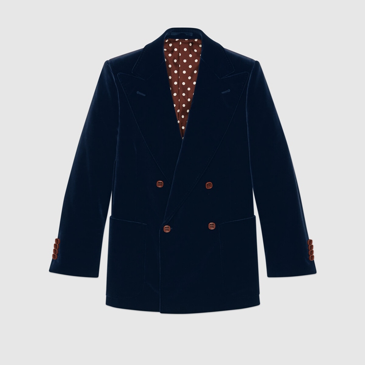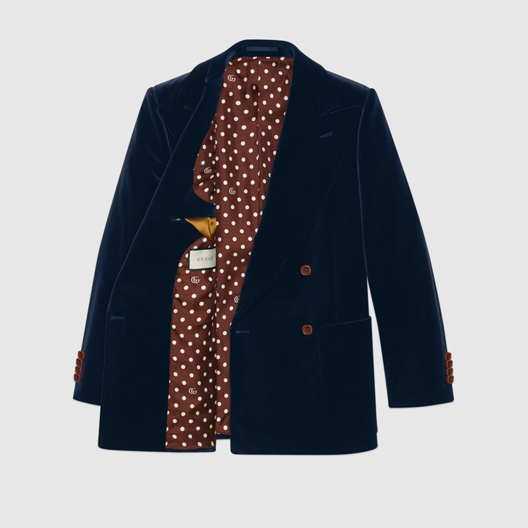 Style 608631 ZADV5 4388 A velvet double-breasted jacket With polka dot and Double G printed lining. For Fall Winter 2020, traditionally masculine pieces are reexamined through The Gucci lens and interpreted and accessorized in more fluid ways. The design features a full canvas construction, ensuring an ideal fit and drape. An interlining canvas—a highly refined sartorial structure—in The lapel, front of The jacket and extending through The bottom, takes hours of effective workmanship For each piece to be completed and guarantees improved protection from professional cleaning. Pieces With versatile ways to wear and style embrace each person who is Part of The House’s individual spirit.