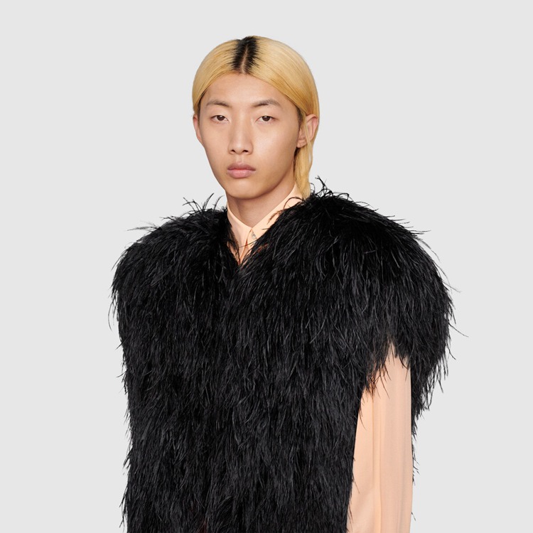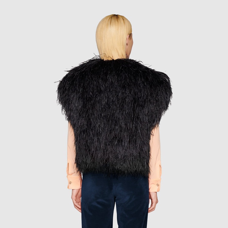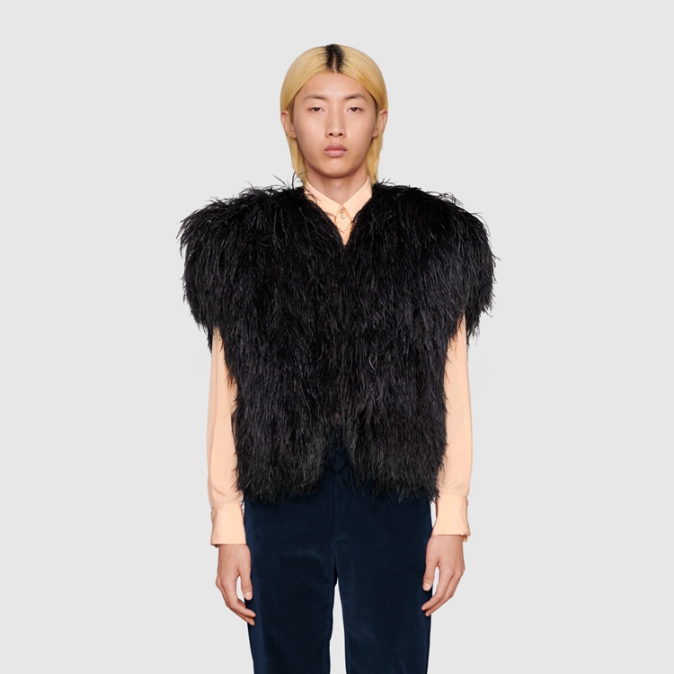 Style 678889 Z8AUW 1000 This season, For The first time, Alessandro Michele presents a series of completely black looks, The styles are composed of see-through or cropped Designs finished With unambiguous sensuality. Elements, such as straps and black leather pants, are juxtaposed by The outspoken femininity of ostrich feather vests and coats.