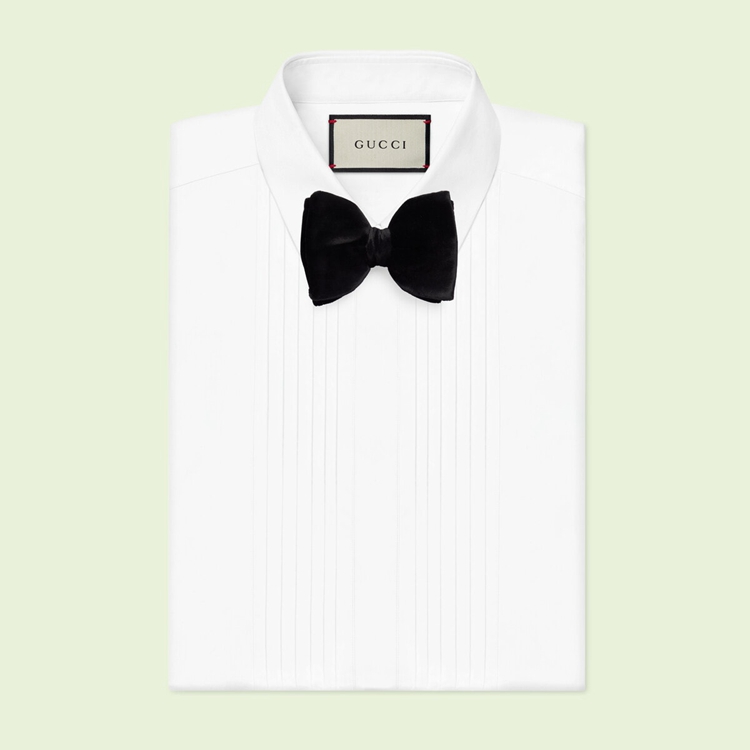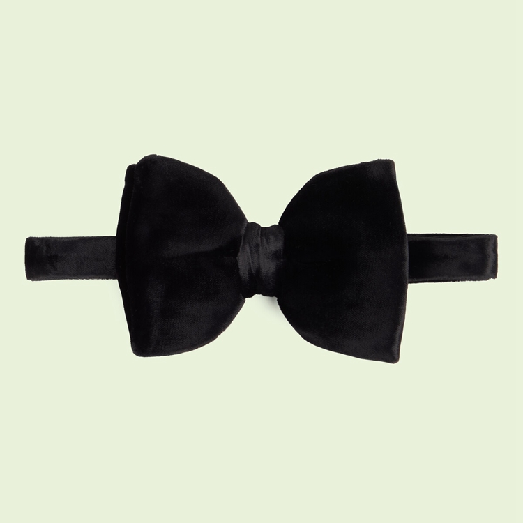 Style 687057 4GACJ 1000 Recalling The golden days of Hollywood film, The bow tie is a signifier of evening elegance. Revisited through The Gucci lens it is proposed alongside wide lapels and a matching waistcoat. Here, a modernized version of The style is Crafted from a viscose and silk blend.