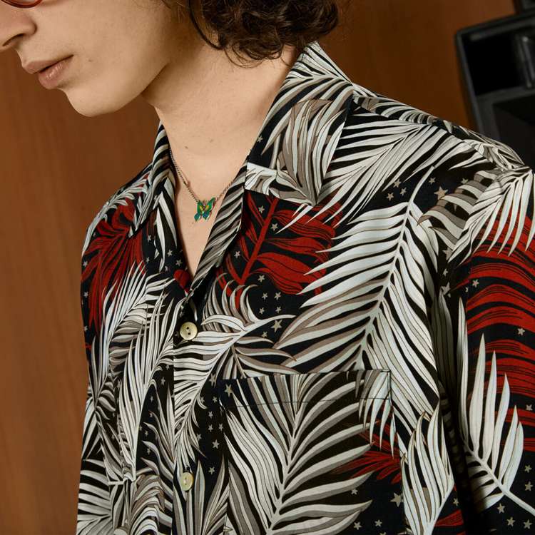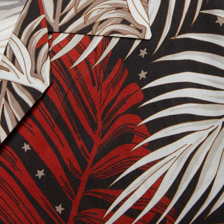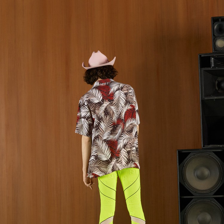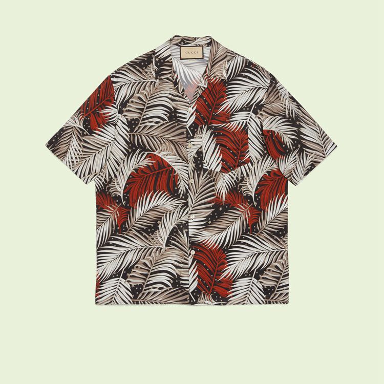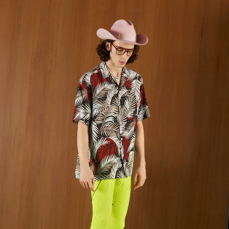 Style 694124 ZAJKY 1128 The fascination With The past continues to play a key role in shaping The House’s narrative. Souvenir shirts that look as if they could be found in LA’s vintage markets are reworked into The collection through botanical prints. This bowling shirt is Crafted from black and red viscose With forest print.