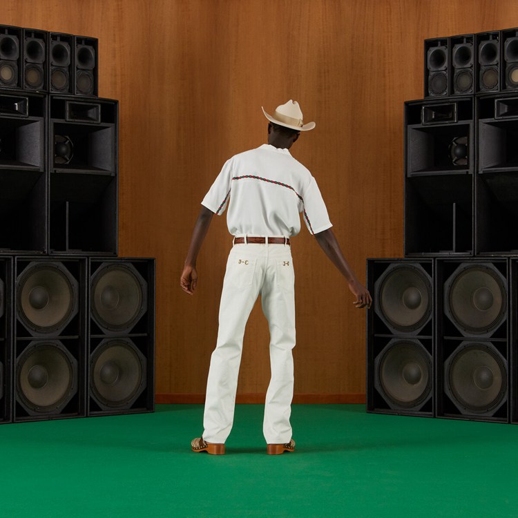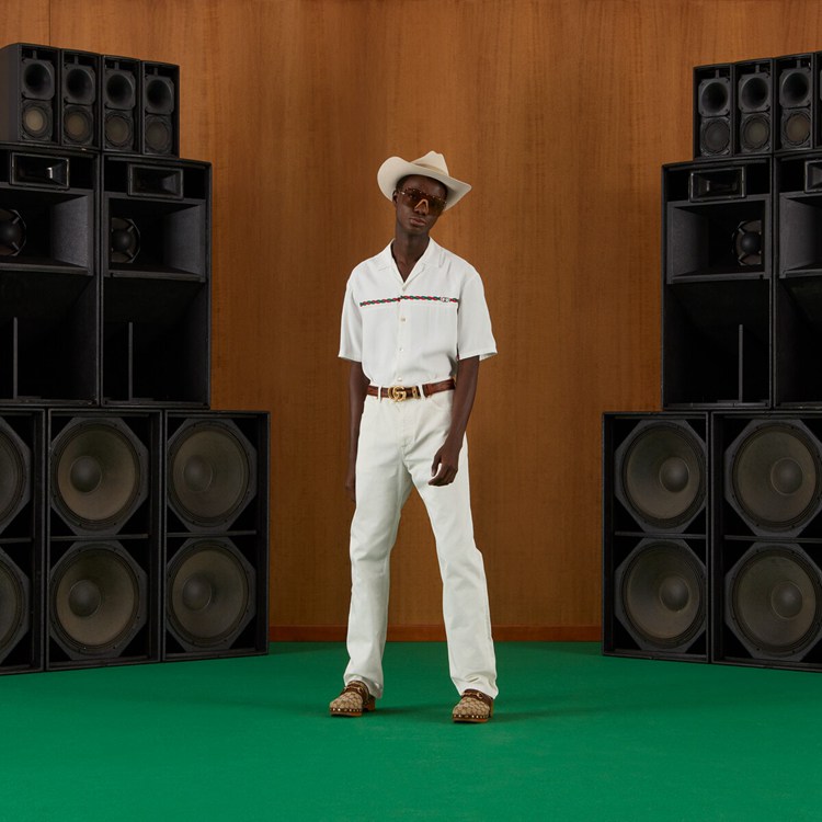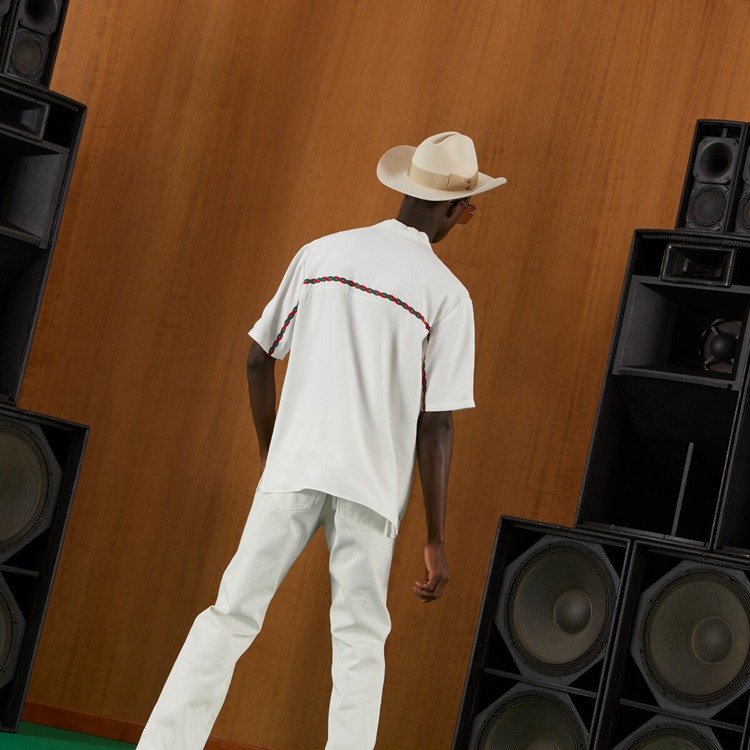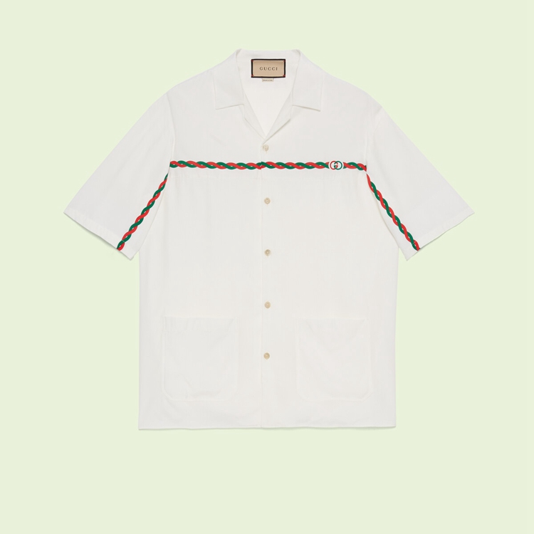 Style 690463 ZAIZB 9743 The Classic red and green Color combination was originally Inspired by The chromatic range of fox-hunting jackets popular in The United Kingdom. To This day The same Color combination continues to act as a code of membership and identification and has evolved year after year. For Gucci Love Parade, The stripe is presented as a braided detail and is paired With The Interlocking G detail on This white viscose bowling shirt.