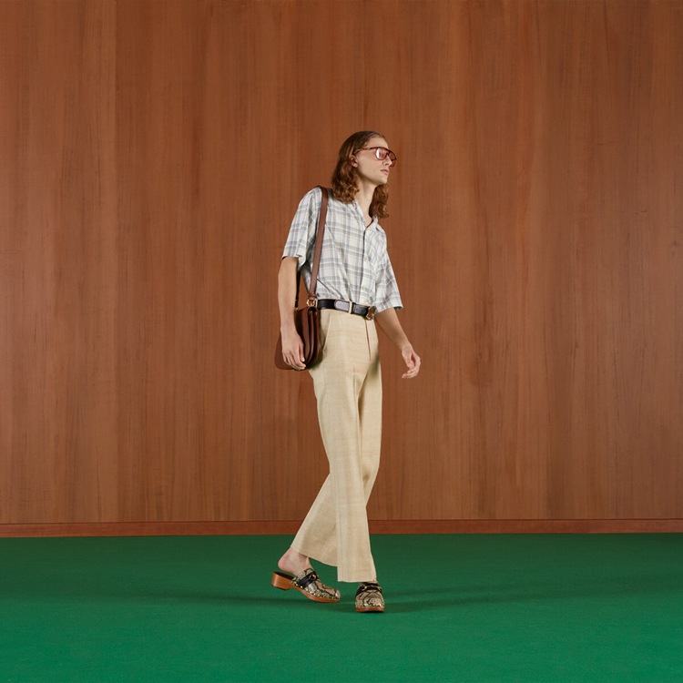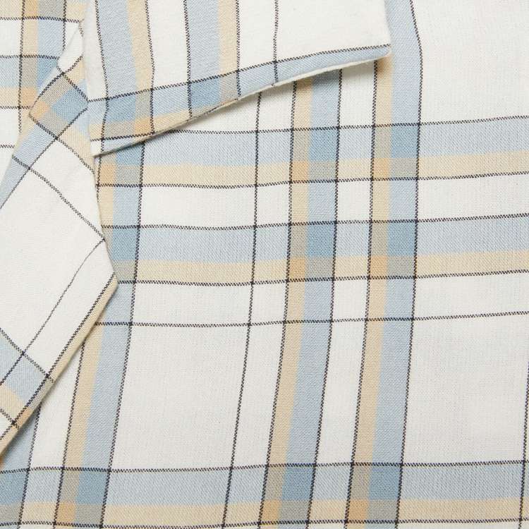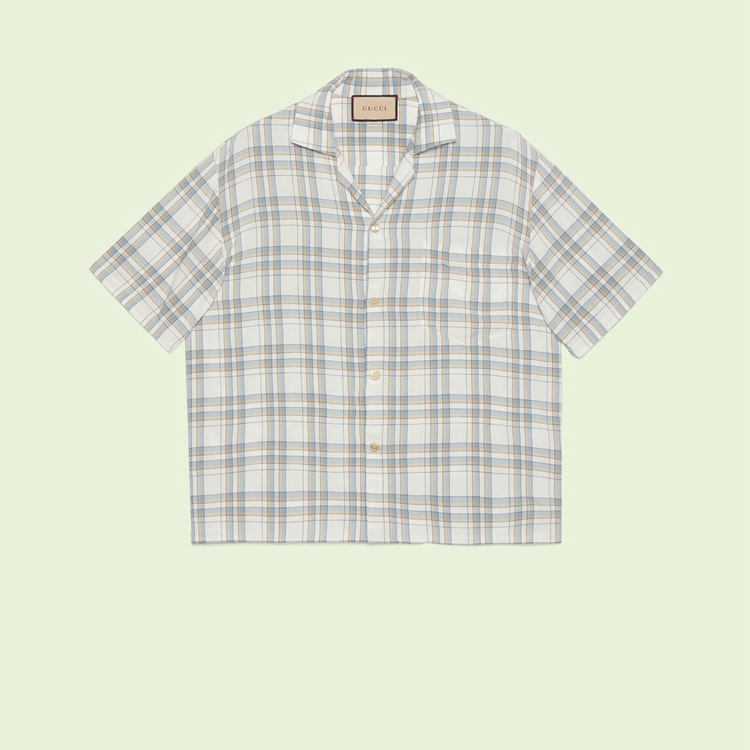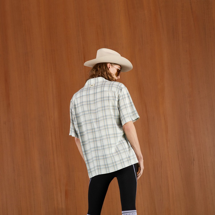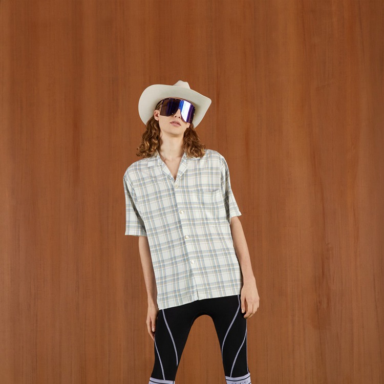 Style 685946 ZAIKH 9738 The fascination With The past continues to play a key role in shaping The House’s narrative. Souvenir shirts that look as if they could be found in LA’s vintage markets are reworked into The collection. Here, This bowling shirt is Crafted from ivory and light blue viscose check.