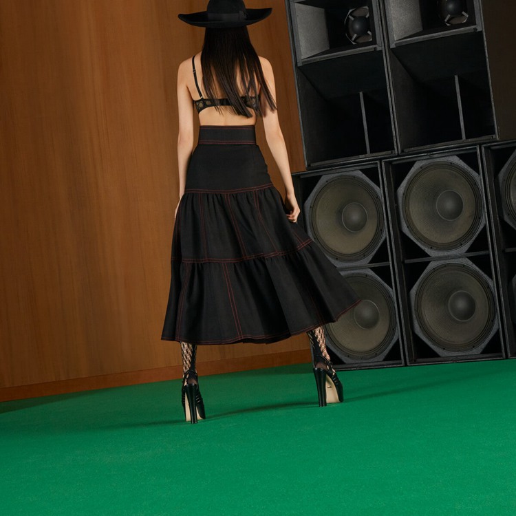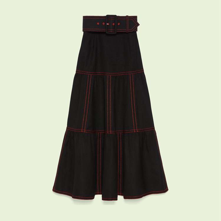 Style 699410 Z8AZW 1043 In a play With proportions and textures, all-black looks unfold throughout The collection, exploring The meaning of dark sensuality. Crafted from black viscose, This skirt features a detachable leather belt on The waist.