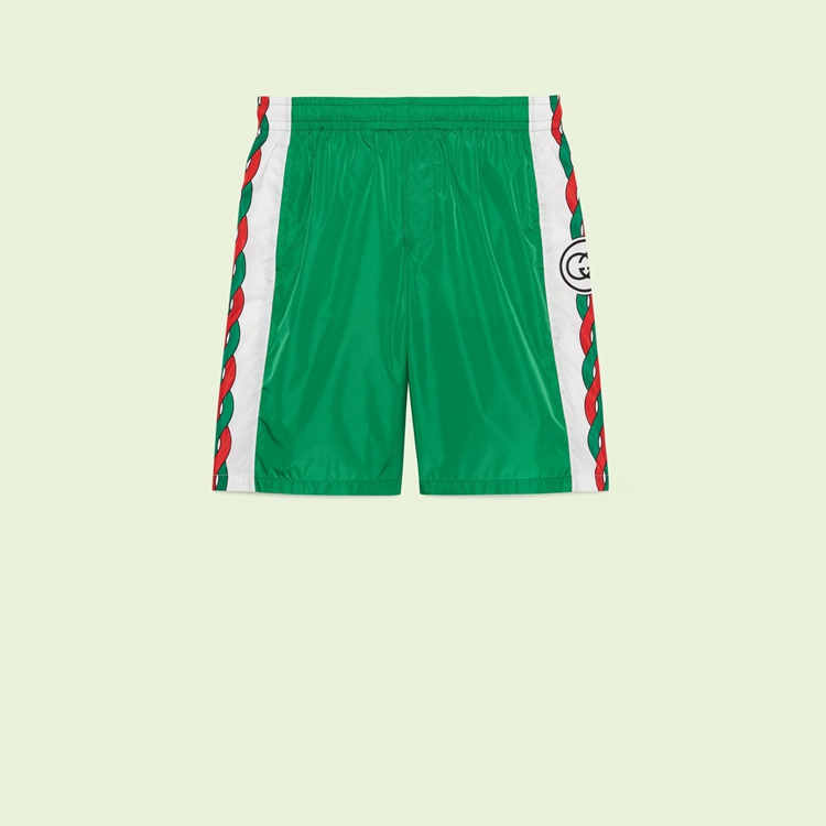 Style 692722 XHAE1 3067 The Classic red and green Color combination was originally Inspired by The chromatic range of fox-hunting jackets popular in The United Kingdom. To This day The same Color combination continues to act as a code of membership and identification and has evolved year after year. For Gucci Love Parade, The stripe is presented as a torchon detail and is paired With The Interlocking G detail on These nylon shorts.