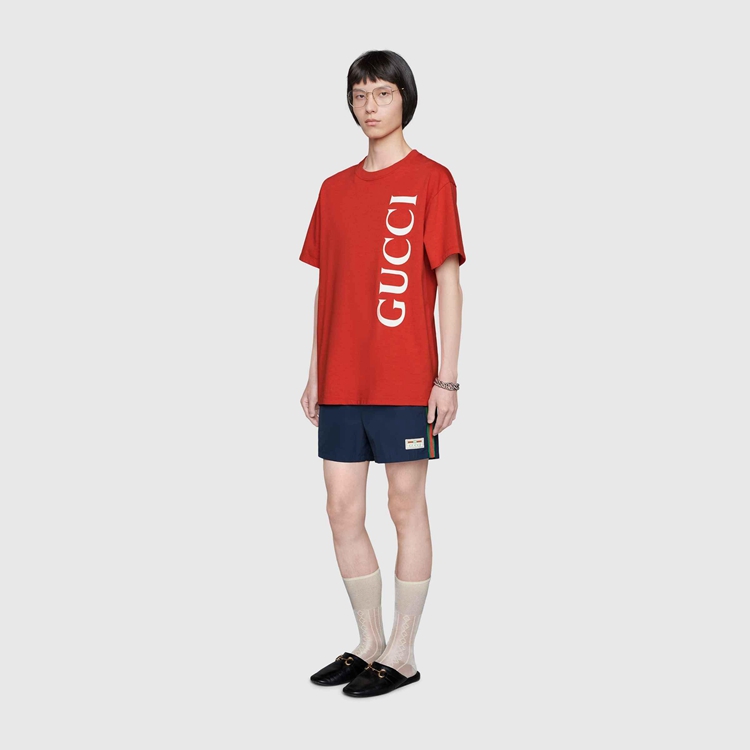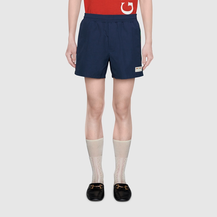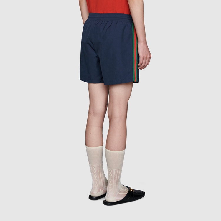 Style 599585 XHAB7 4728 Crafted from waterproof nylon, These swim shorts are completed by an elastic waistband With drawstring. The green and red Web ribbon runs down The sides and gives them an athletic feel With The Gucci jacquard label.