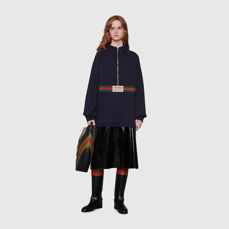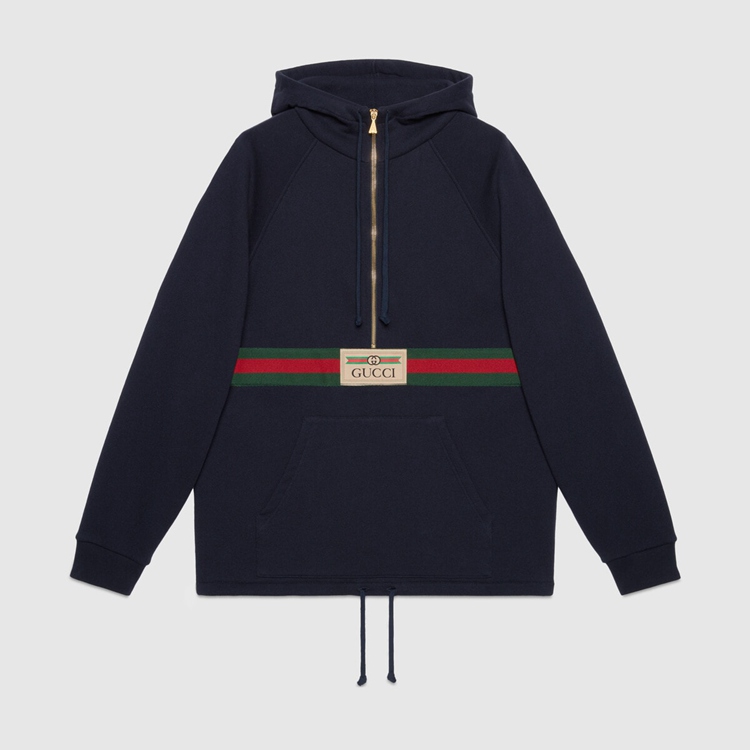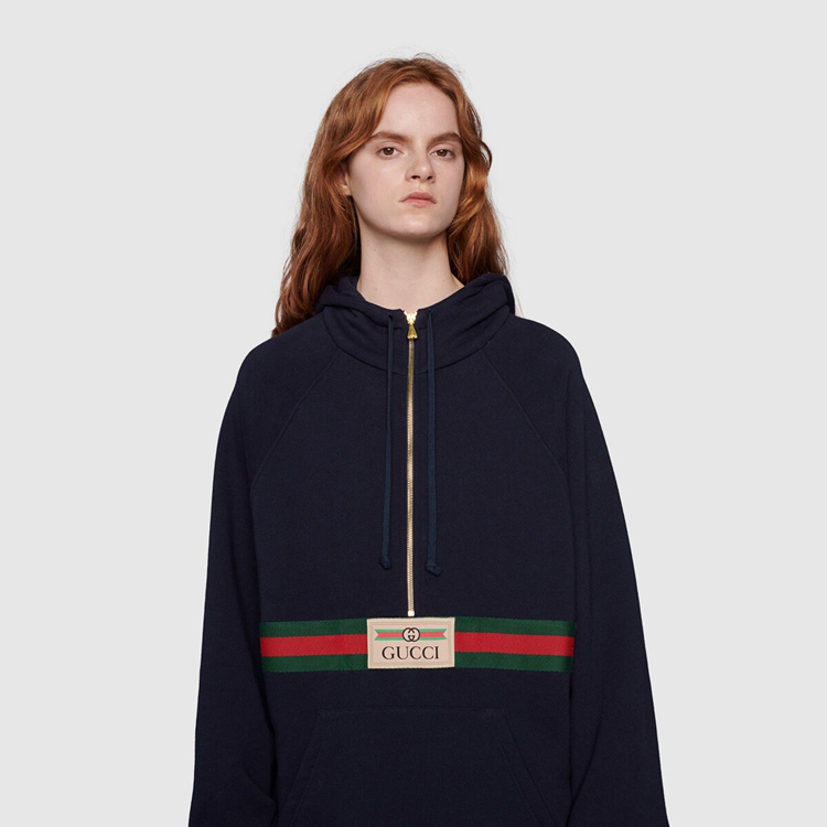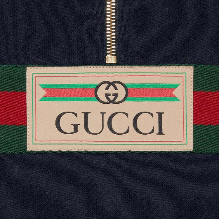 Style 644656 XJC3W 4440 Taking cues from The archives, The Web is a key element of Alessandro Michele’s collections and reinforces The homage paid to Gucci’s past. Paired on This ink blue sweatshirt With The vintage Gucci logo, it stands as a reference to The equestrian heritage of The House.