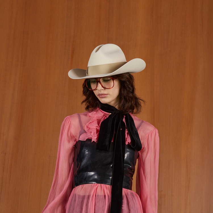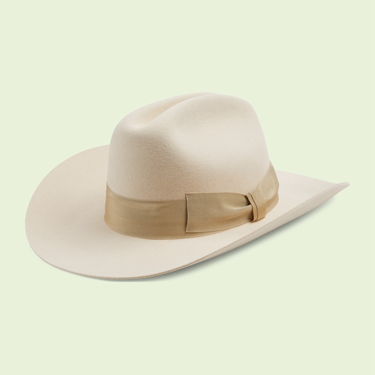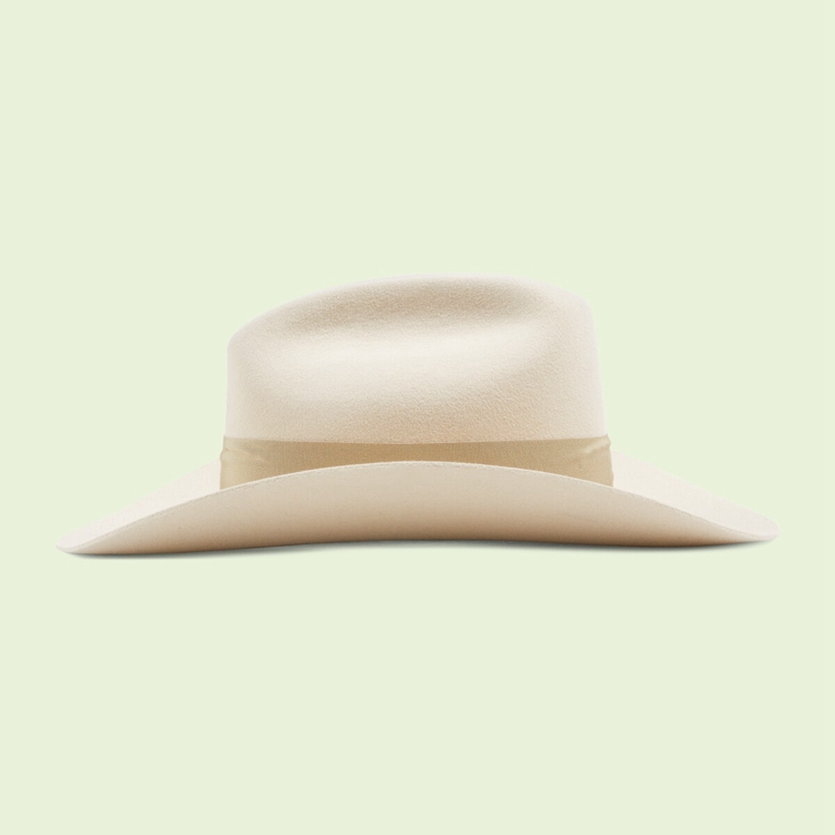 Style 697199 4HANF 9278Paired With evening suits and jumpsuits, felt wide-brimmed hats completed ready-to-wear looks With country charm, Recalling The Western styles that gained notoriety during The 19th and 20th centuries. This item is Part of Gucci’s MX, a selection that embraces freedom of expression and explores identity norms.