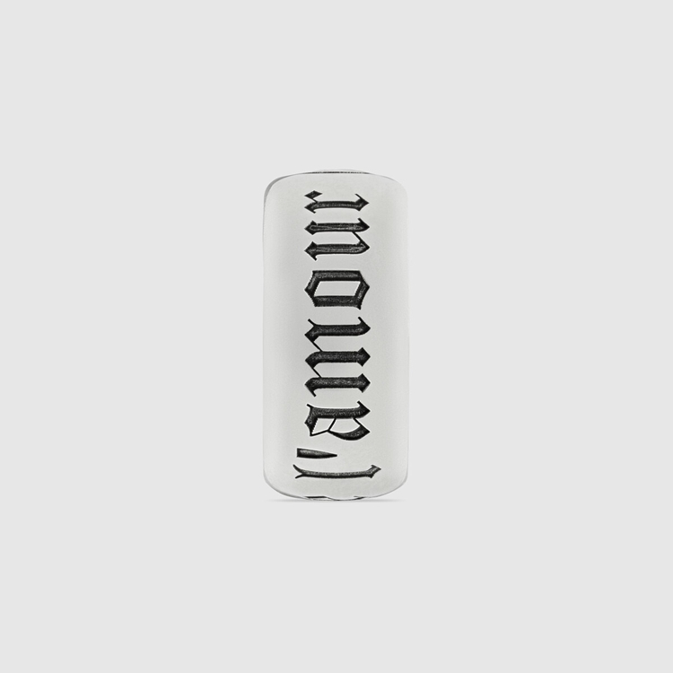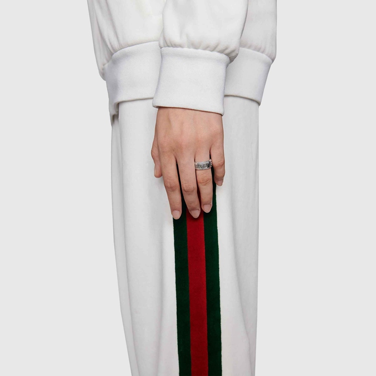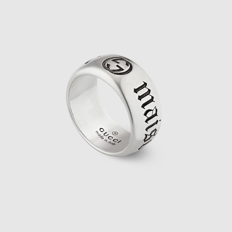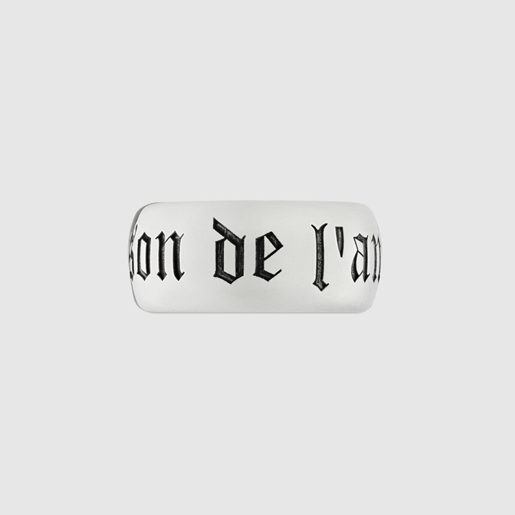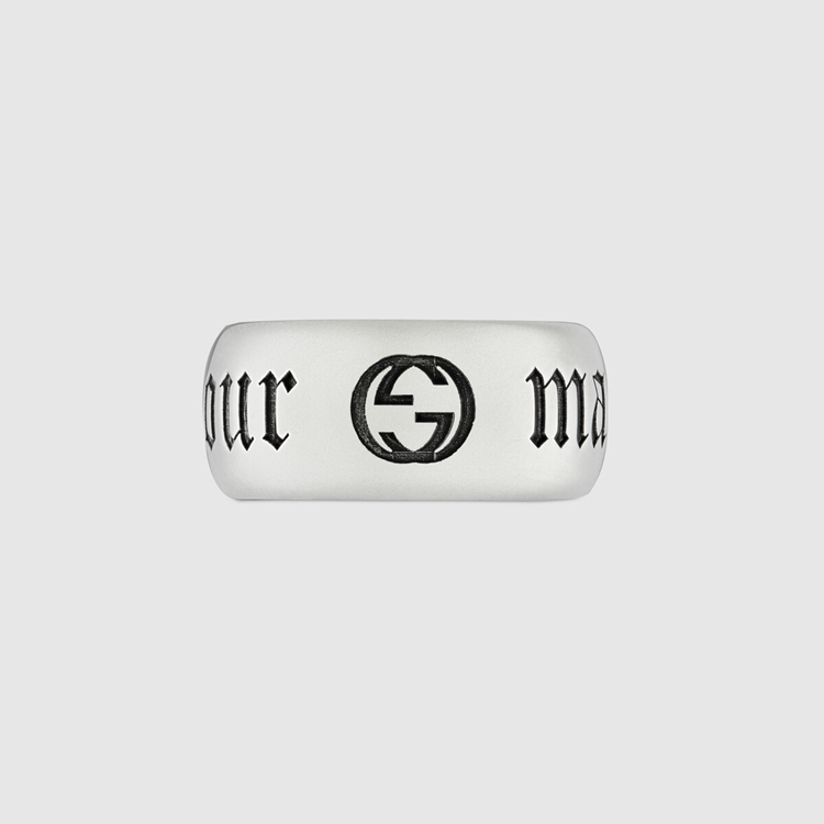 Style 678666 J8400 0701 A wide ring in silver engraved With The signature Interlocking G. The phrase ‘Maison de l’Amour’ completes The style, reflecting The House’s romantic narrative.