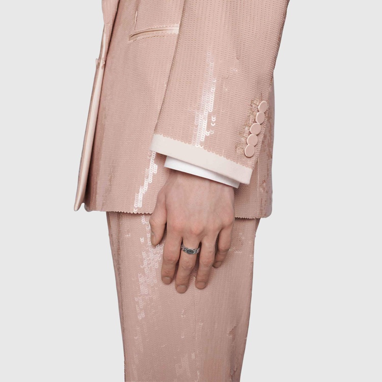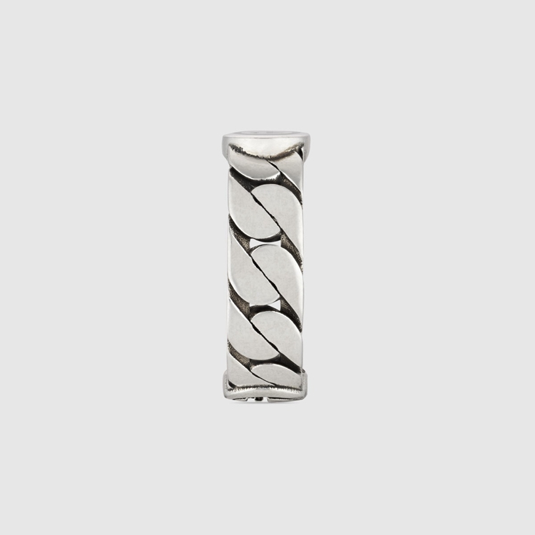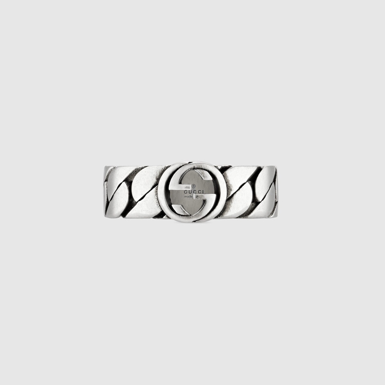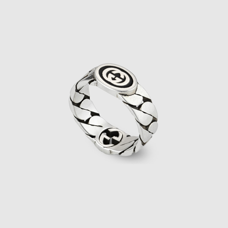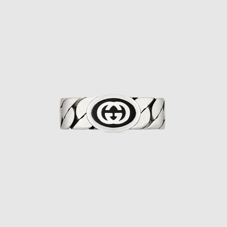 Style 678656 J8410 8191 This ring is Crafted With a wide gourmette construction, Recalling The chain of vintage necklaces. Throughout The Gucci Aria Collection, vintage references are reimagined through a contemporary lens, uniting both The past and present. The enameled Interlocking G monogram adds a finishing touch to The accessory.