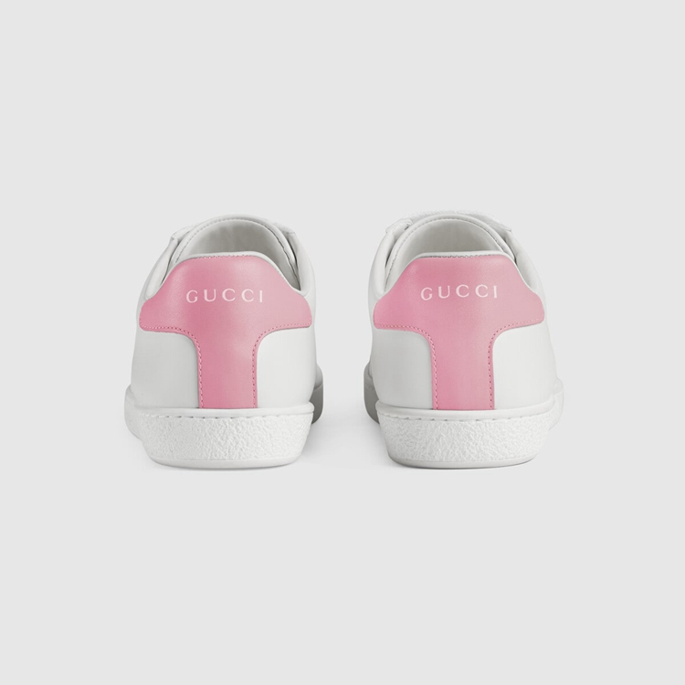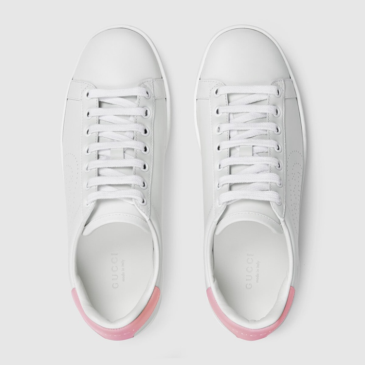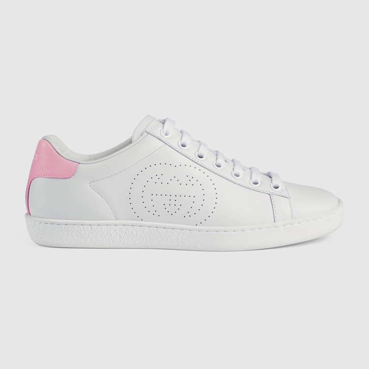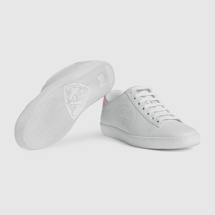 Style 598527 AYO70 9076 Crafted from soft, white leather, The Emblematic Ace sneaker is enhanced With a minimalist logo approach. With an intricate design, The Interlocking G is displayed on The side of The shoe, created using a perforated technique. Soft pink leather details at The back of The shoe add a subtle hint of Color to The all-white style.