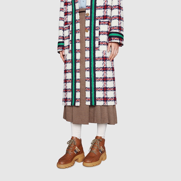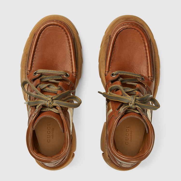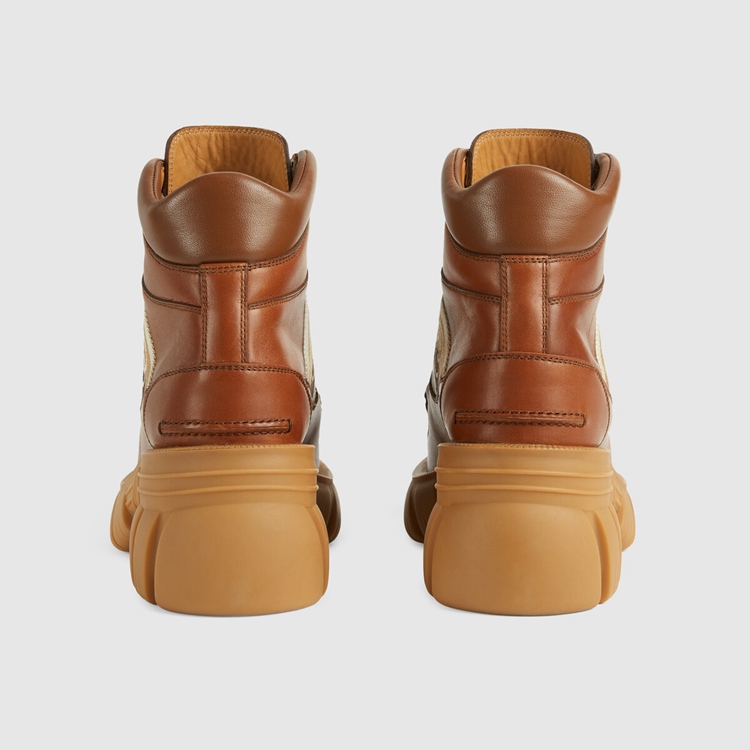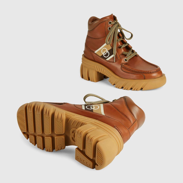 Style 663594 DTNE0 2560 The House continues to look to The world of sports and leisure as a source of inspiration. Crafted from cuir colored leather, This pair of ankle boots references These influences With its lug sole and lace-up closure. The mood is further enhanced by a monogram stripe detail—reminiscent of logo tapes found on vintage tracksuits.