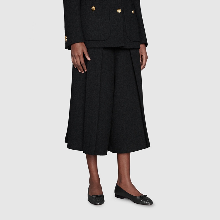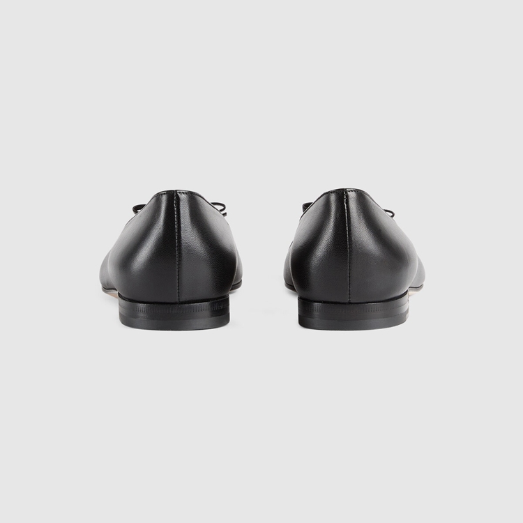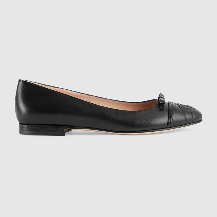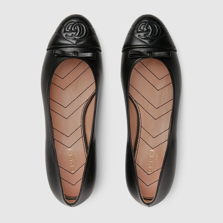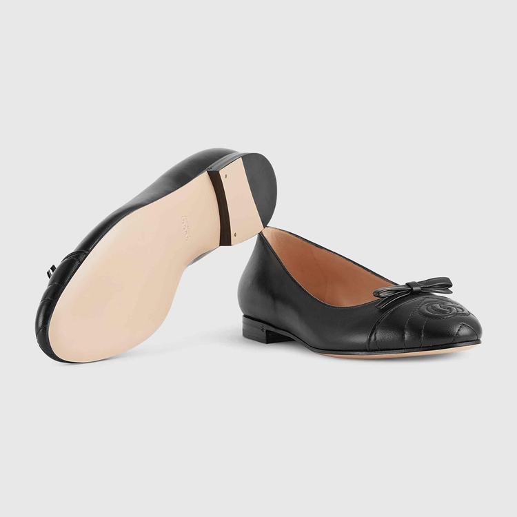 Style 680878 BKO60 1000 A historical design that can be traced back to The French revolution, The ballet flat is reincarnated For Gucci Aria through whimsical details and House codes. The shoe is presented in smooth black leather With a geometric matelassé detail at The front. Giving The style a logo feel, The initials of Guccio Gucci appear as an intricate stitched detail while a bow completes The design.