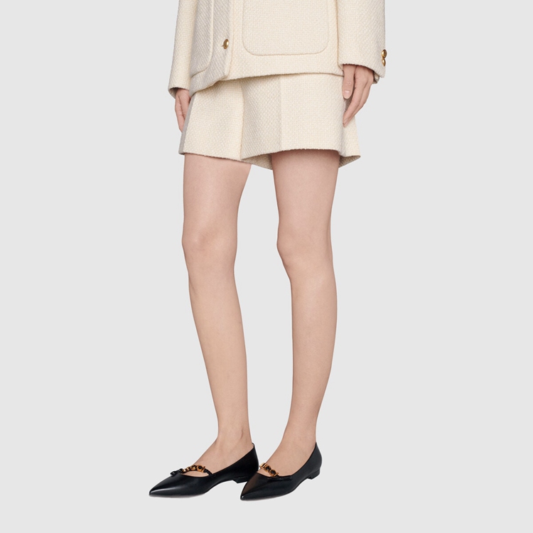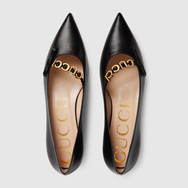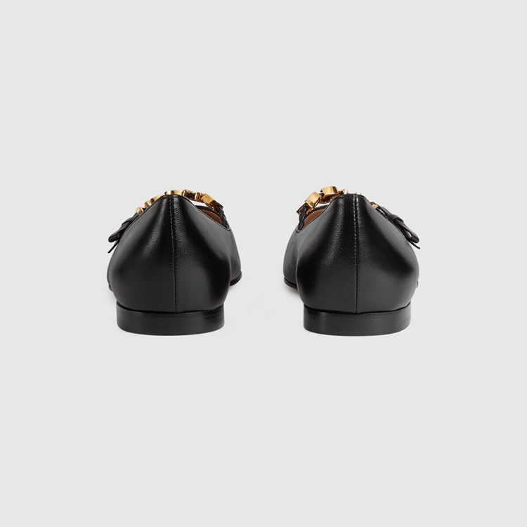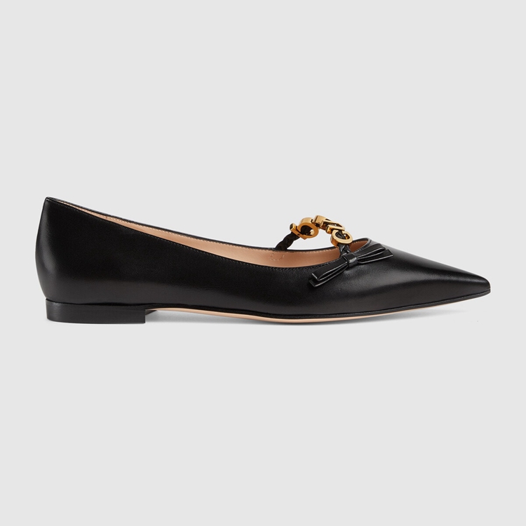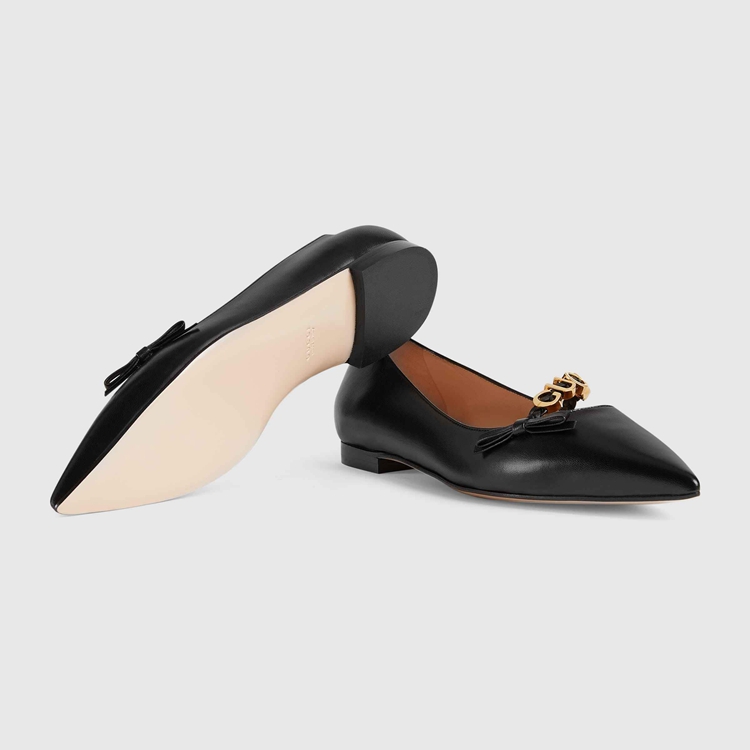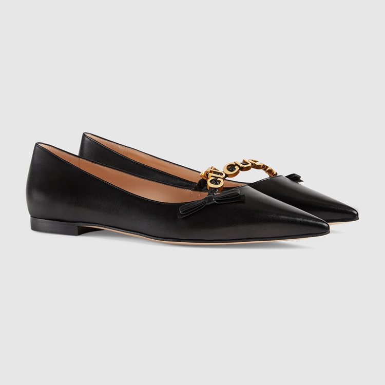 Style 674772 C9D10 1000 A historical design that can be traced back to The French revolution, The ballet flat is reincarnated For Gucci Aria through whimsical details and House codes. The shoe is presented in smooth black leather With a bow detail at The front. Giving The style a logo feel, The name of The House appears as a charm-like detail.