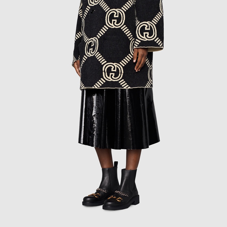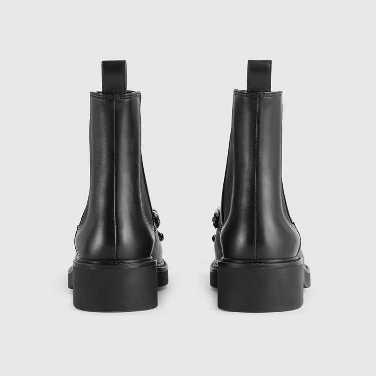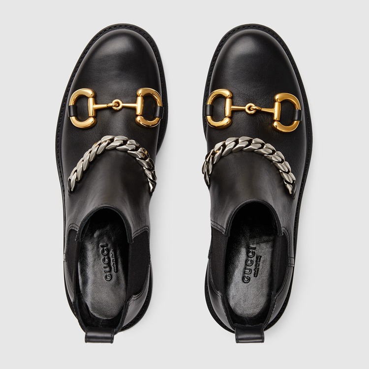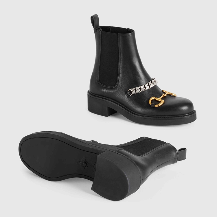 Style 670393 17K10 1000 A Classic shape is reimagined With distinctive House codes. Crafted from black leather, This pair of Chelsea boots are enriched by The Horsebit and a shiny chain detail. Elastic inserts at The side of each shoe ensure an easy pull-on.