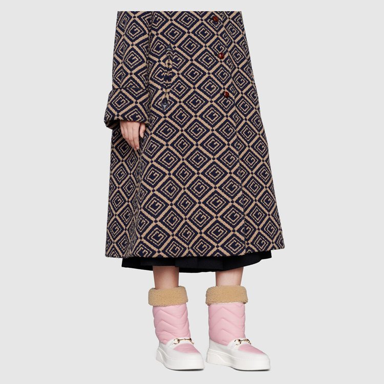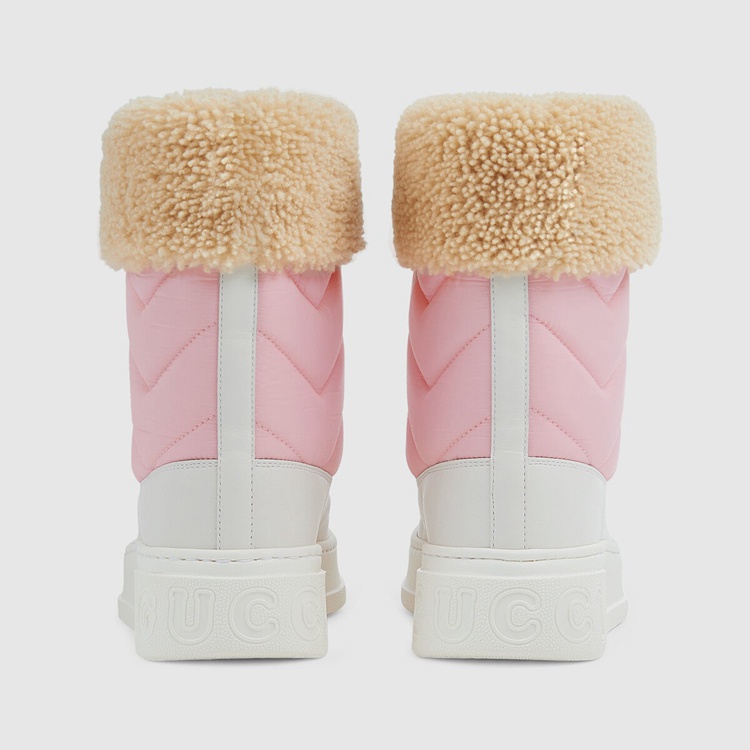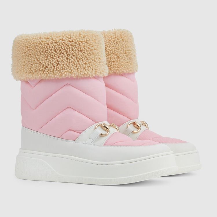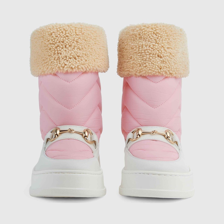 Style 673559 UFR20 5760 This pair of boots combines quilted nylon With The Horsebit detail. Taken from The House’s equestrian roots, The historic gold-toned hardware contrasts With a contemporary emblem of The House— The chevron matelassé motif—to present a New take on both symbols. Leather details complete The pink and white design, highlighting The style’s retro- Inspired silhouette.