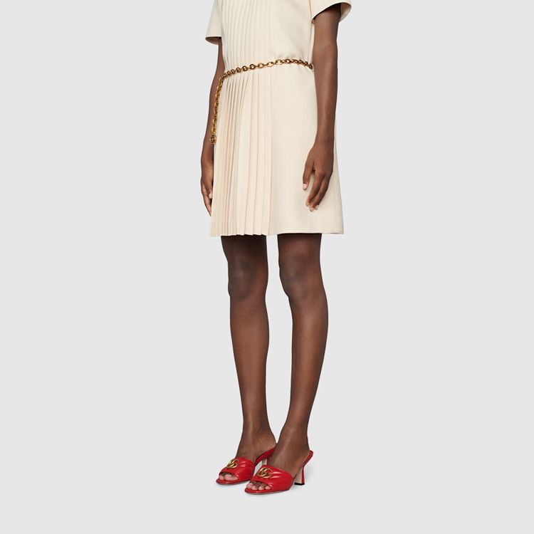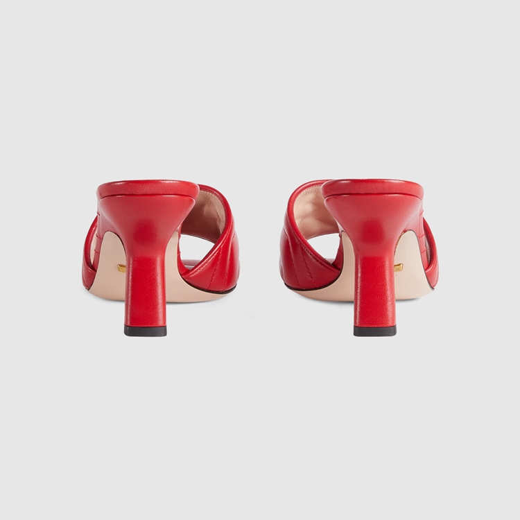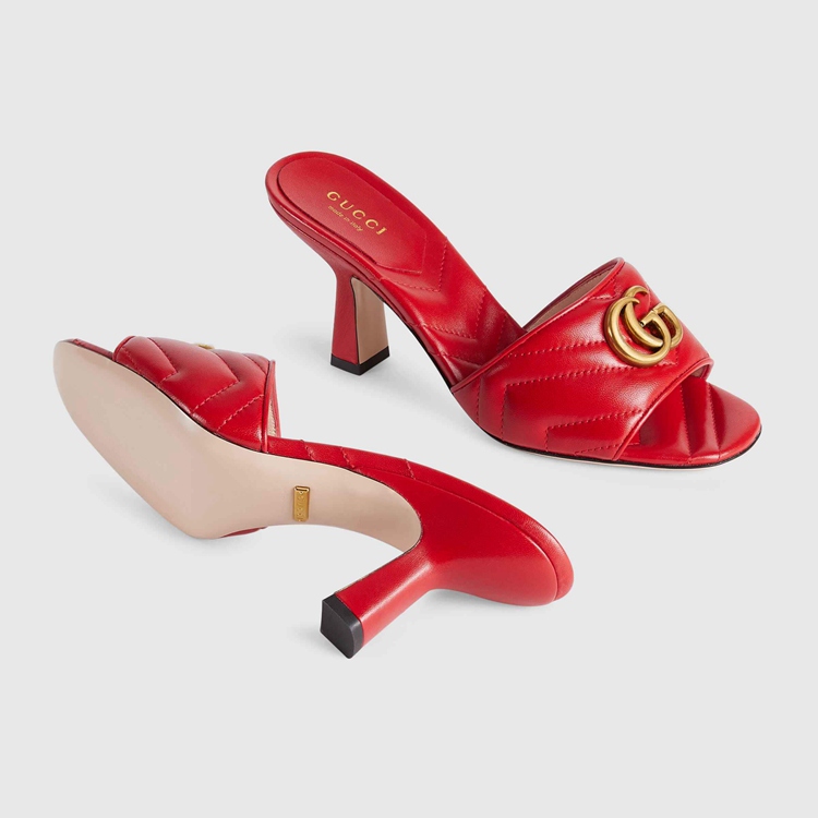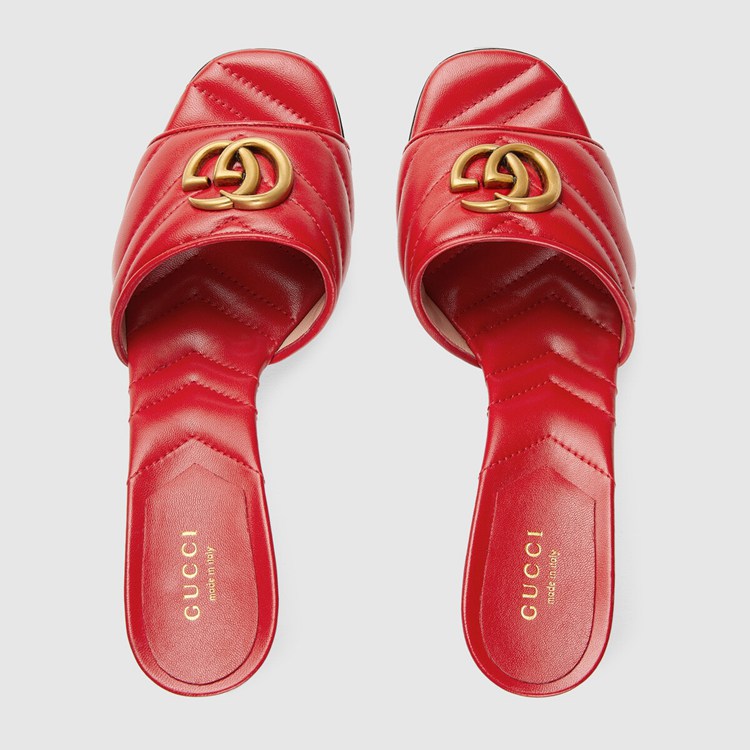 Style 674839 BKO00 6549Textures and colors combine to present a contemporary approach to The Classic slide. Crafted from red chevron matelassé leather, The shoe is completed by The House’s gold-toned monogram hardware.