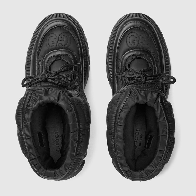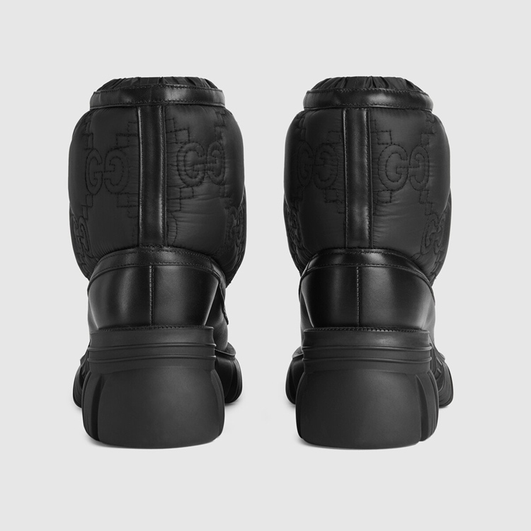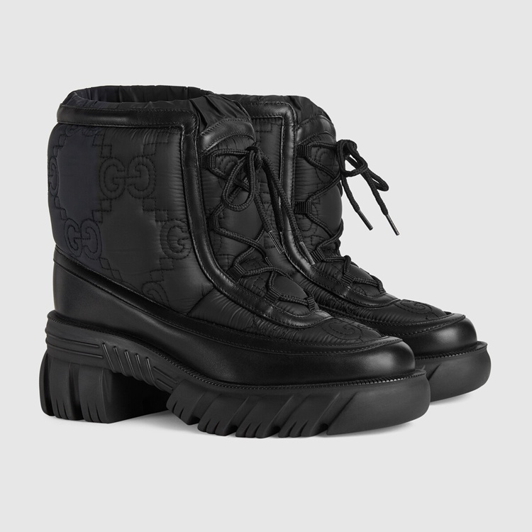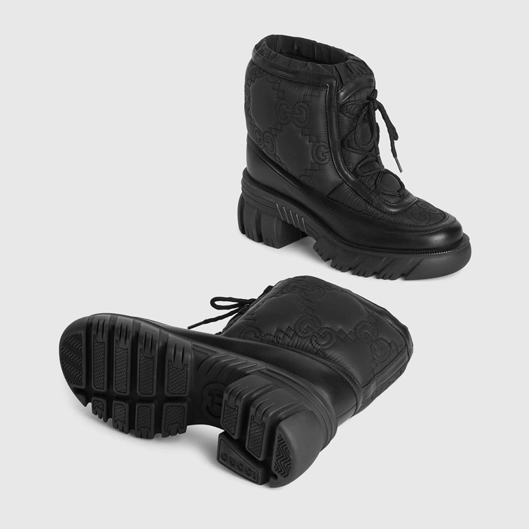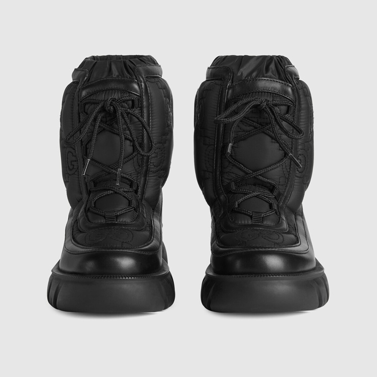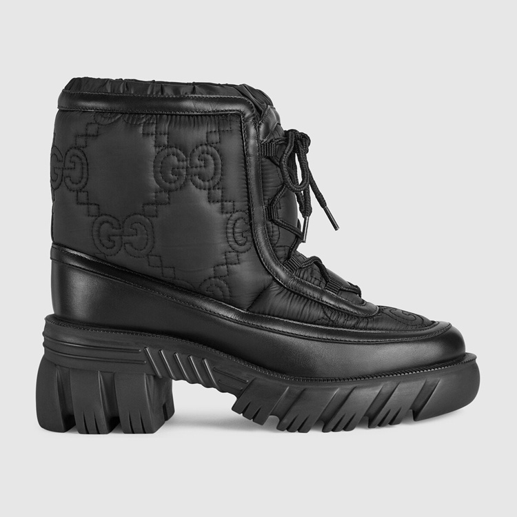 Style 680874 UF720 1000Reminiscent of traditional outerwear, This pair of black ankle boots has a chunky silhouette— enhanced by a defined lug sole. The Gucci Aria collection plays With The traditional by adding Emblematic logo details such as This style’s tonal GG motif. Crafted from white nylon With a leather trim, The design is completed by a crisscross lace-up closure.