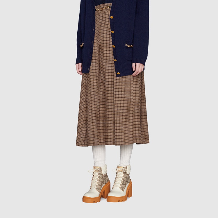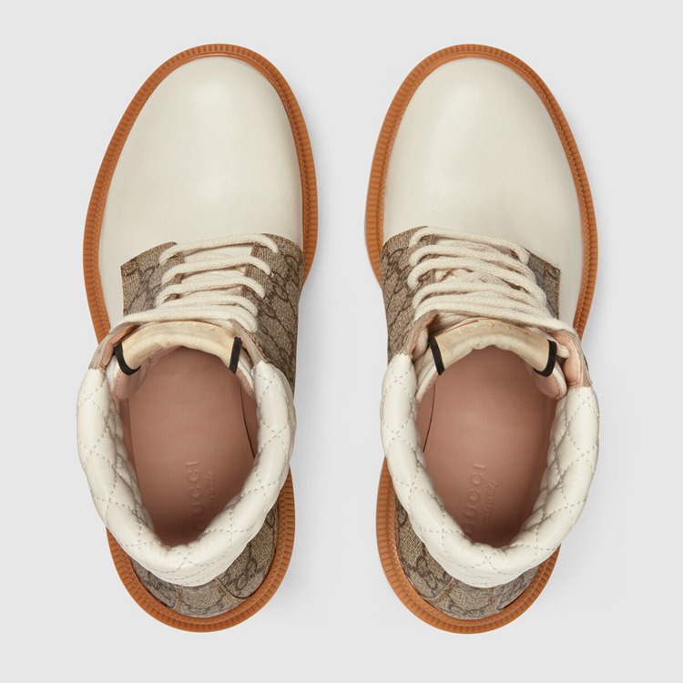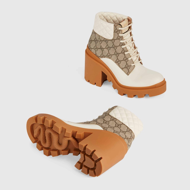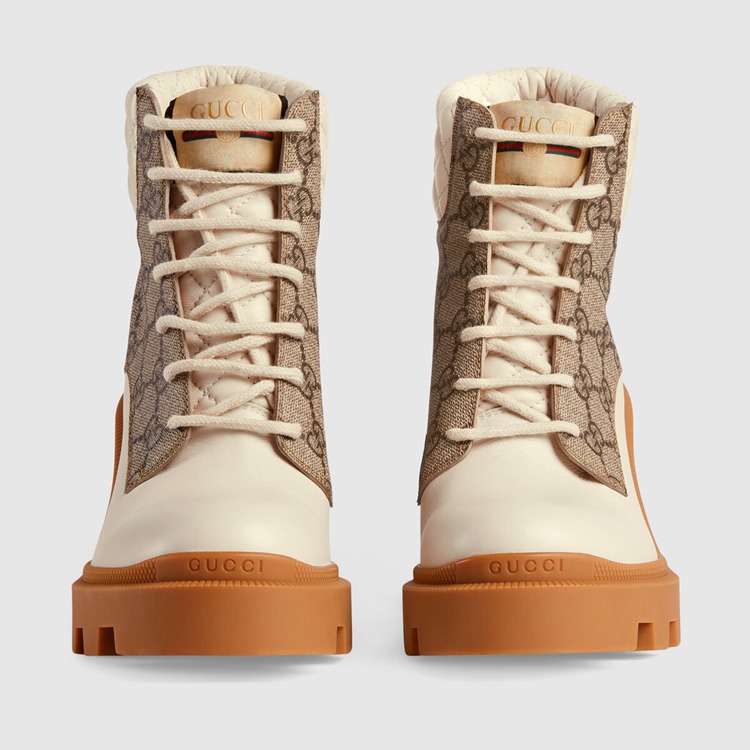 Style 659691 UC810 9066 A historical source of inspiration For The House, The world of sports and leisure continues to influence its design narrative. This pair of women’s ankle boots interprets The theme by combining a lug sole With a lace-up closure and a quilted leather detail at The ankle. In homage to The Founder of The House, The style is presented in beige and ebony GG Supreme canvas.