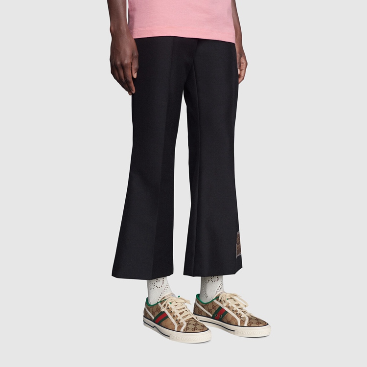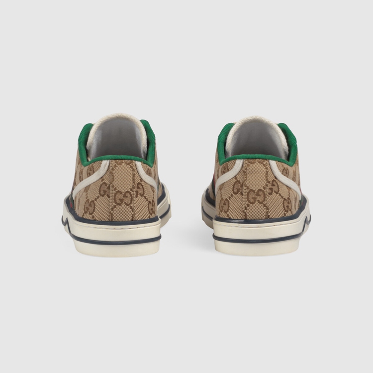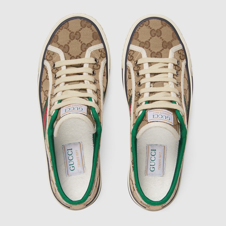 Style 606110 HVK20 9766 The low-top sneaker is presented in Original GG canvas in its Classic Color combination of beige and ebony. The style combines different elements from The House’s heritage such as The Gucci Tennis 1977 label, a textured GG motif at The sole and The Web—details which recall The House’s connection to The world of sports and leisure.