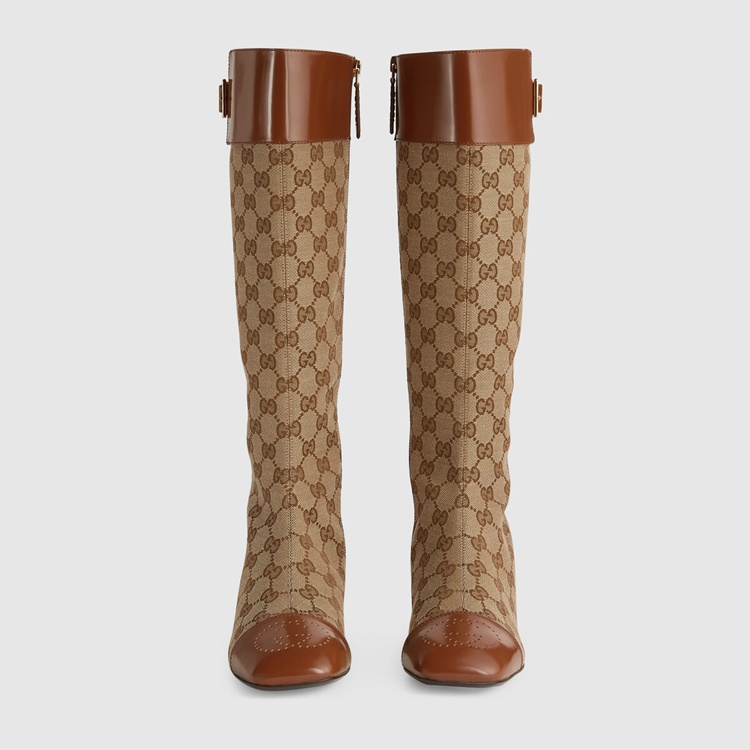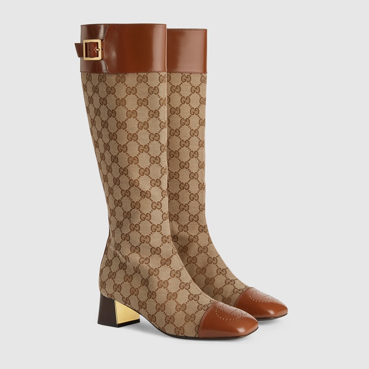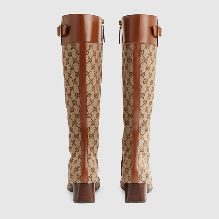 Style 678278 HVKL0 9786Influences from other times continue to inspire The House. Recalling Gucci’s equestrian roots, This pair of boots are presented With a structured knee-high shape and a logo buckle detail..