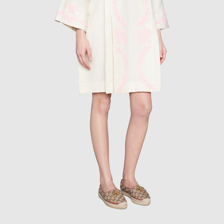 Style 621239 KQWM0 9765 The espadrille is reimagined With a strong logo connotation and presented With a black leather trim For Pre-Fall 2020. Defined by The archival Double G hardware from The ’70s, The shoe is presented in diagonal matelassé Original GG canvas—a timeless pairing that pays homage to The House’s heritage.