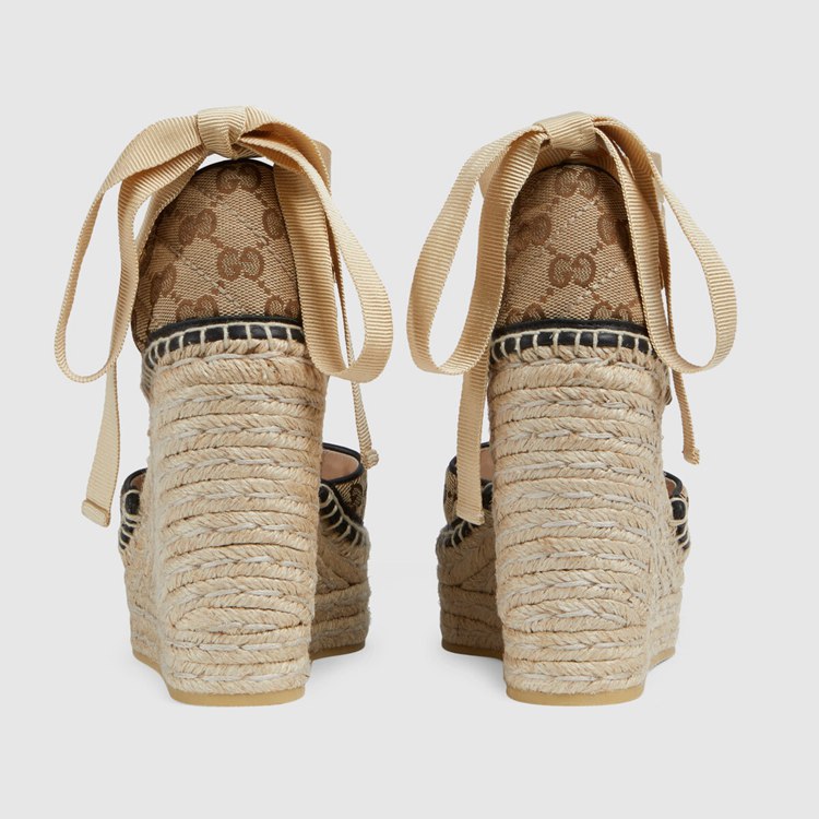 Style 621240 HVK60 9764 The espadrille platform sandal is reimagined With a strong logo connotation For Spring Summer 2020. Defined by The archival Double G hardware from The ’70s, The shoe is presented in diagonal matelassé Original GG canvas—a timeless pairing that pays homage to The House’s heritage.