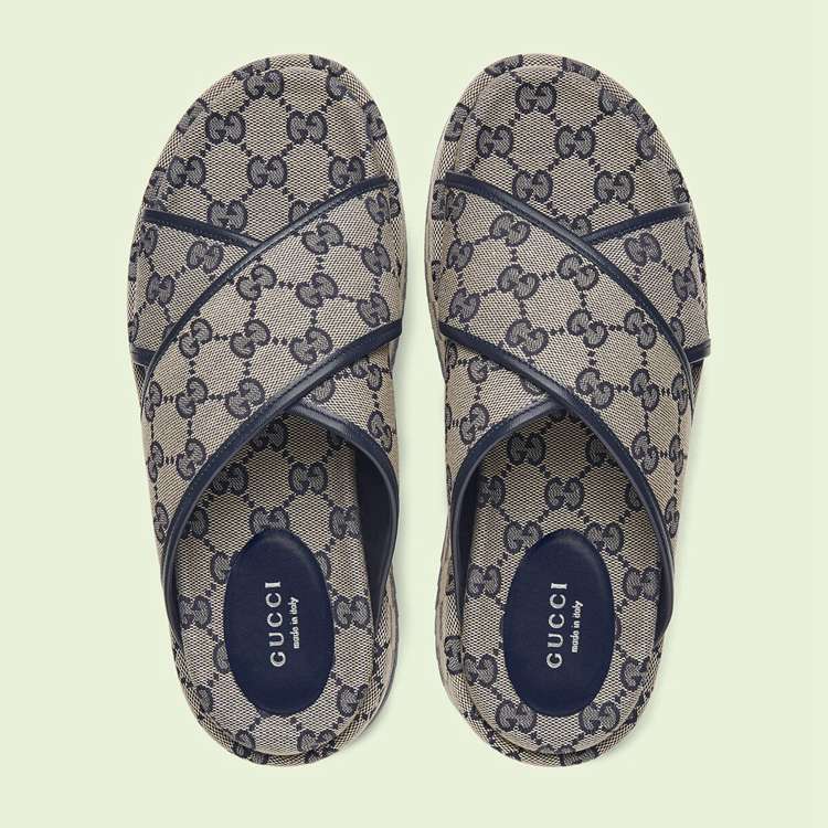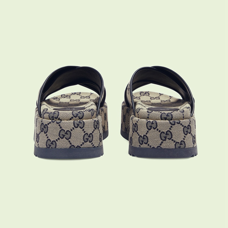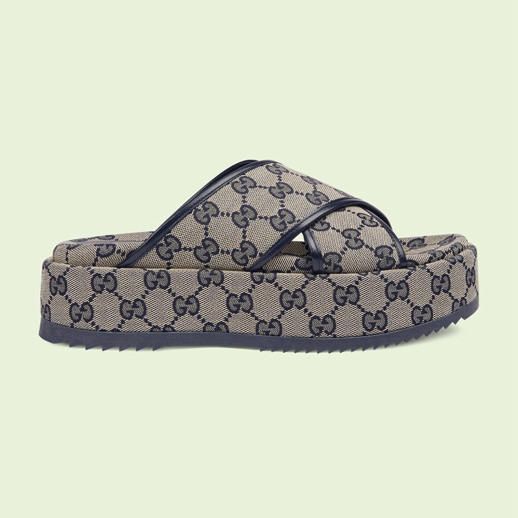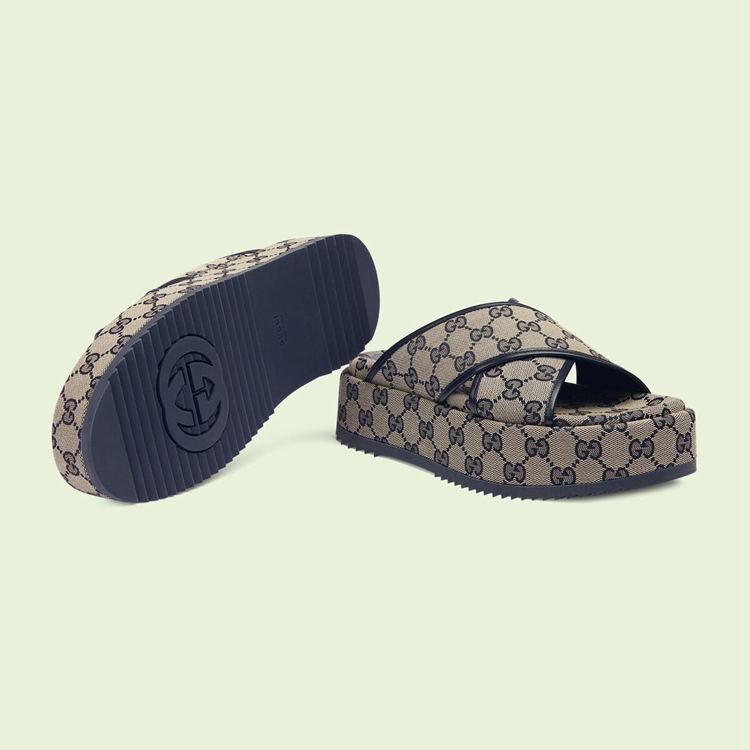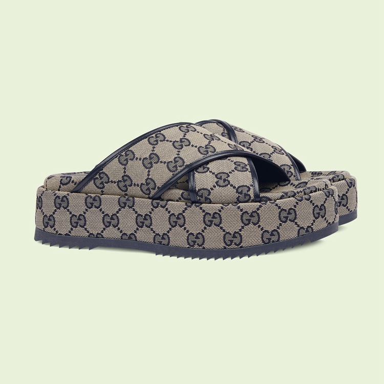 Style 692842 H6320 4061Mirroring The pattern’s historic origins, The GG motif is introduced in a timeless mix of blue and beige For Gucci Love Parade. Coming to The fore of each collection decade after decade, The monogram design has become a hallmark of The House. Here, The palette defines This pair of platform slide sandals.