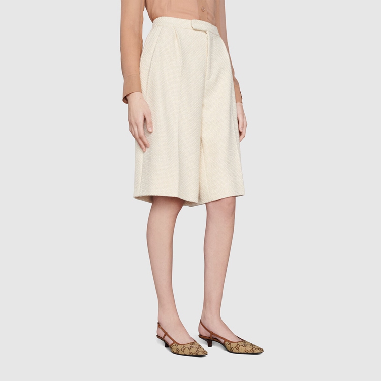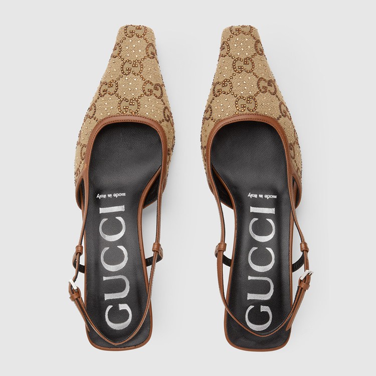 Style 675441 9SF10 2583 The Gucci Aria collection takes references from The archives of The ’90s and early ‘2000s, With pieces Inspired from Tom Ford’s era in Gucci. The New idea of femininity shows glamorous details, such as lace, crystals and sheer fabrics. This pair of slingback shoes are presented in beige canvas With a sparkling GG motif.