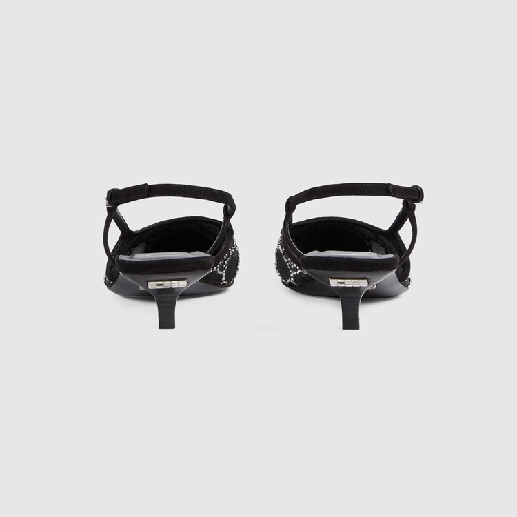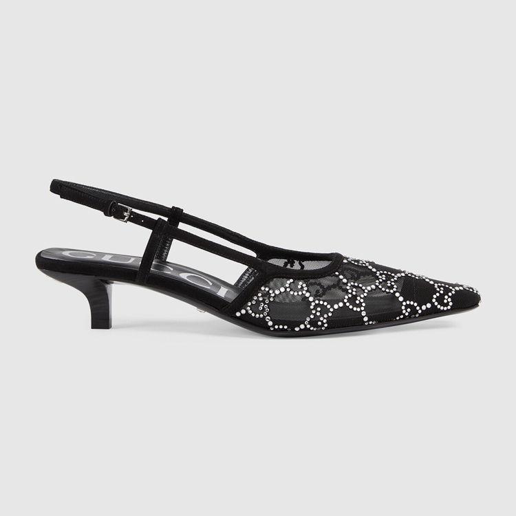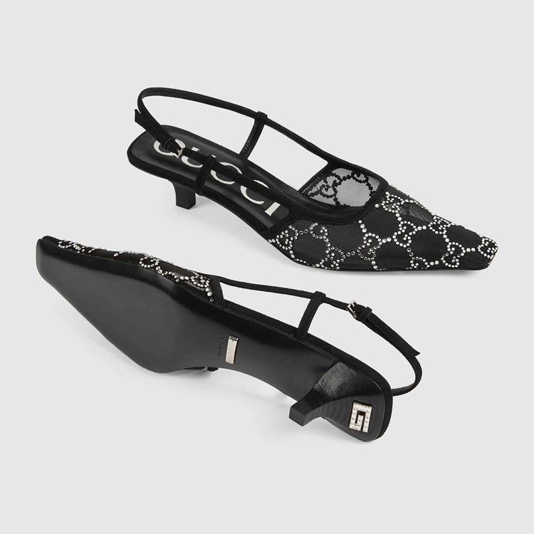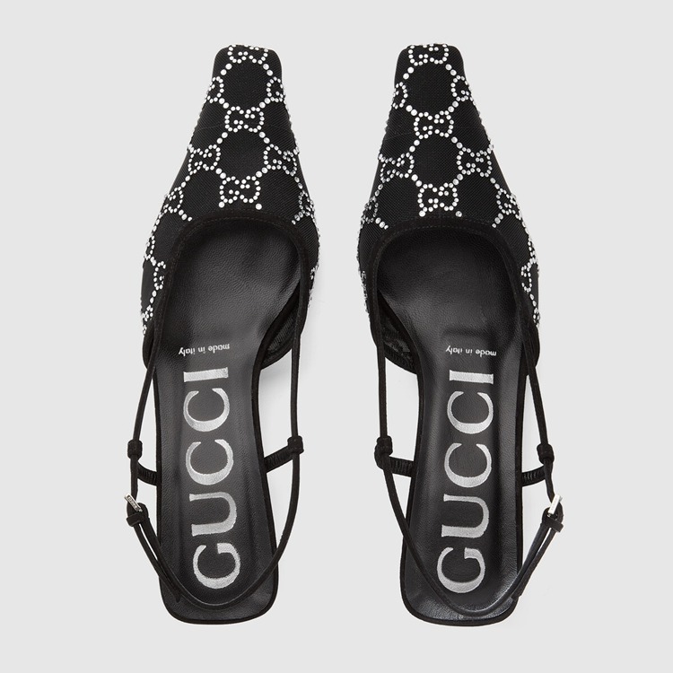 Style 675829 F13A0 1000 The Gucci Aria collection takes references from The archives of The ’90s and early ‘2000s, With pieces Inspired from Tom Ford’s era in Gucci. The New idea of femininity shows glamorous details, such as lace, crystals and sheer fabrics. This pair of slingback shoes are presented in black mesh With a sparkling GG motif.