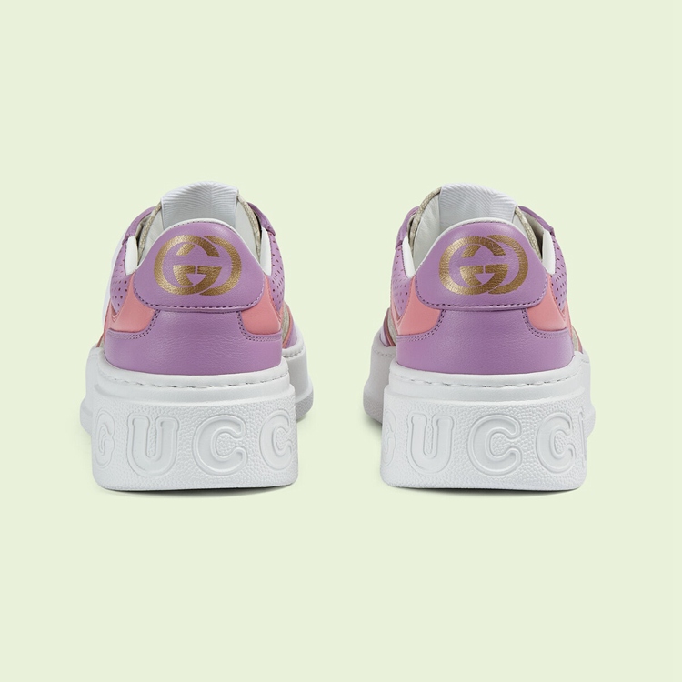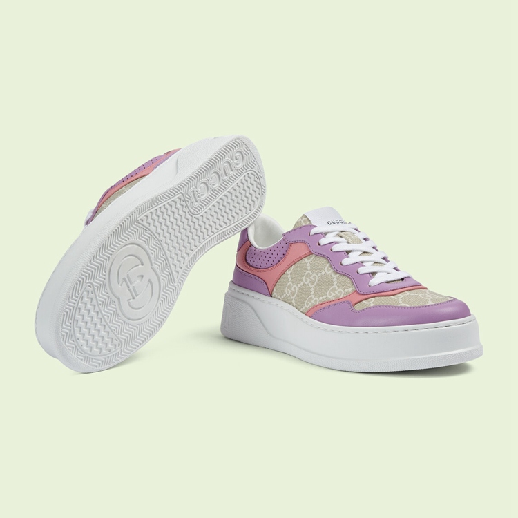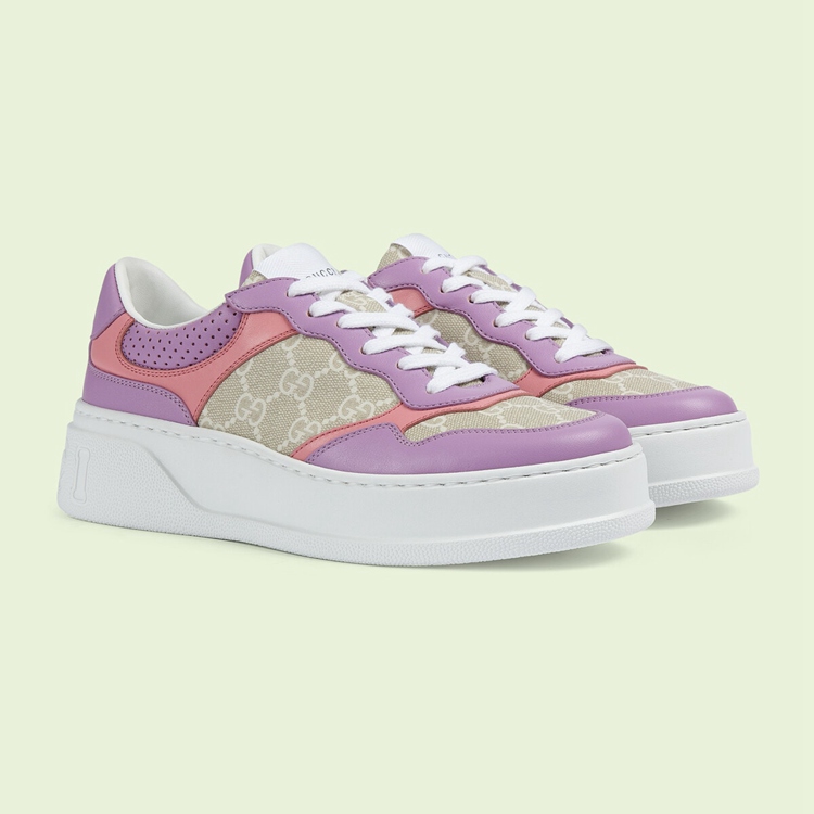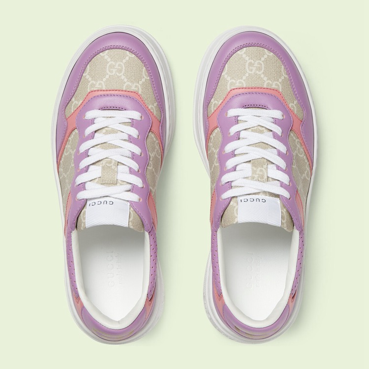 Style 670408 UPG90 5471 Pastel colors add a playful note to The collection, adding a Retro aesthetic to Classic silhouettes. This pair of chunky sneakers is presented in a mix of different materials With an Interlocking G print at The back. An Emblematic material, white and beige GG Supreme canvas is framed by pink and purple leather.