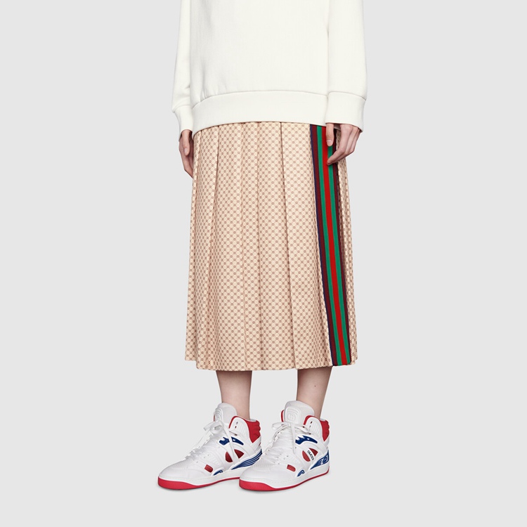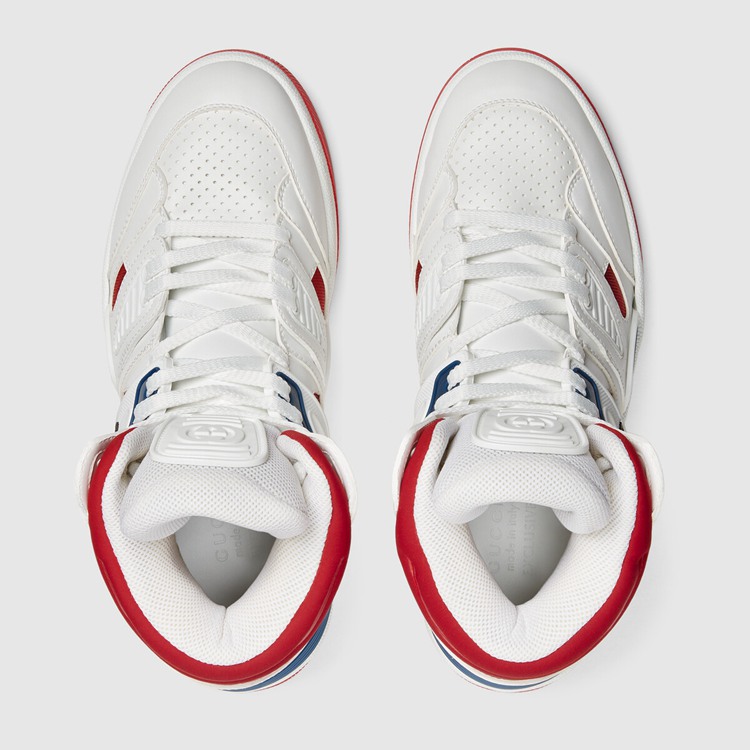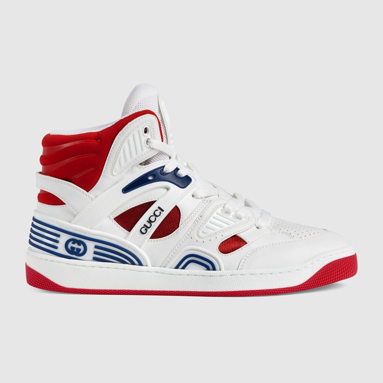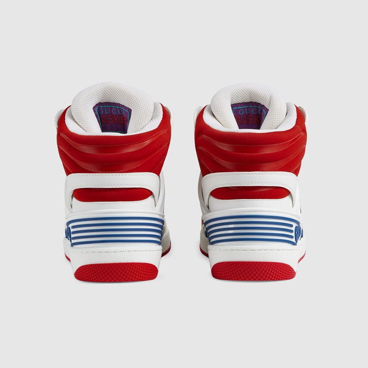 Style 665688 2SHA0 9070 Sporting a look synonymous With basketball sneakers from The ‘90s, The House introduces The newest rendition of The lace-up sneaker— Gucci Basket. This high-top style emulates The self-expression of on-court aesthetic With distinctive features and detailing. Offered in a mix of brightly colored fabrics and finished With a lightly distressed effect, each pair is Crafted primarily from Demetra. Created With The same processes used For tanning, The New material offers pliable and resilient performance With a supple finish. The eco-friendly material combines animal-free raw materials primarily from sustainable, renewable, and bio-based sources.